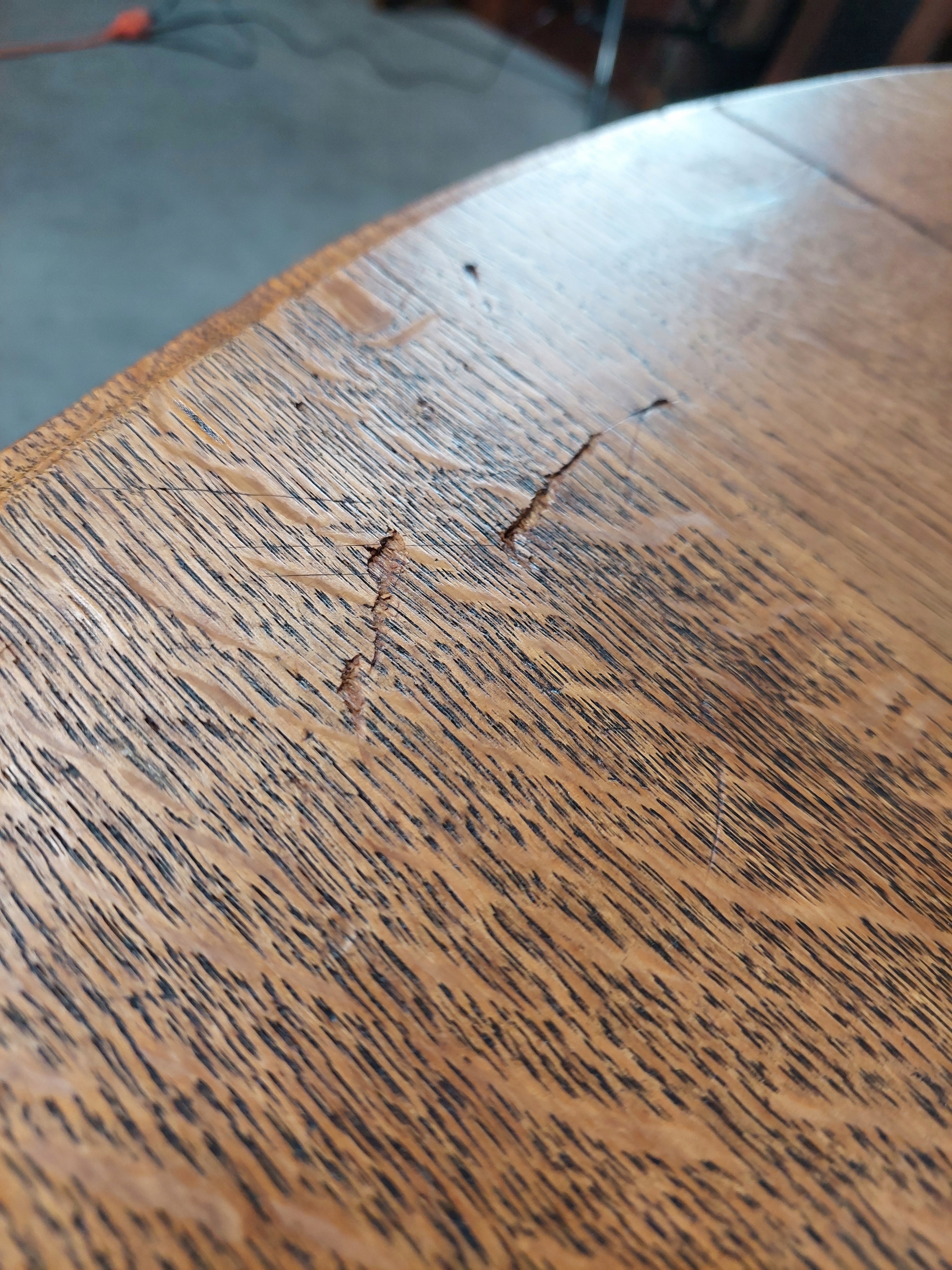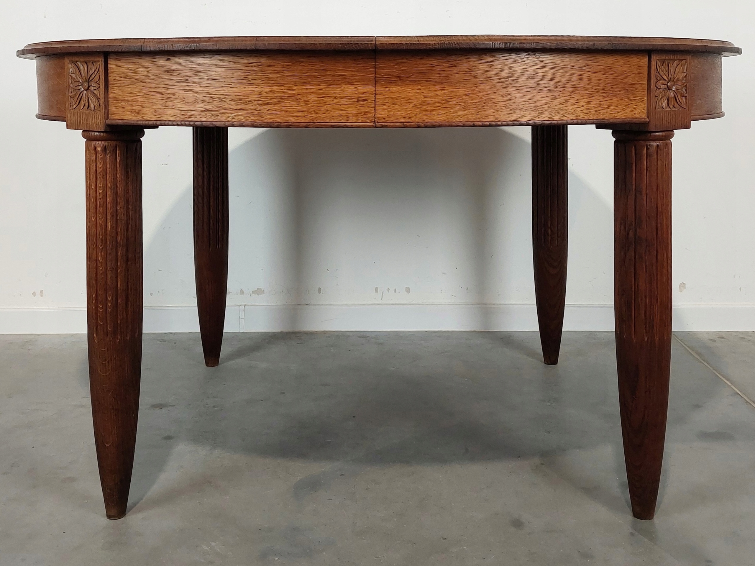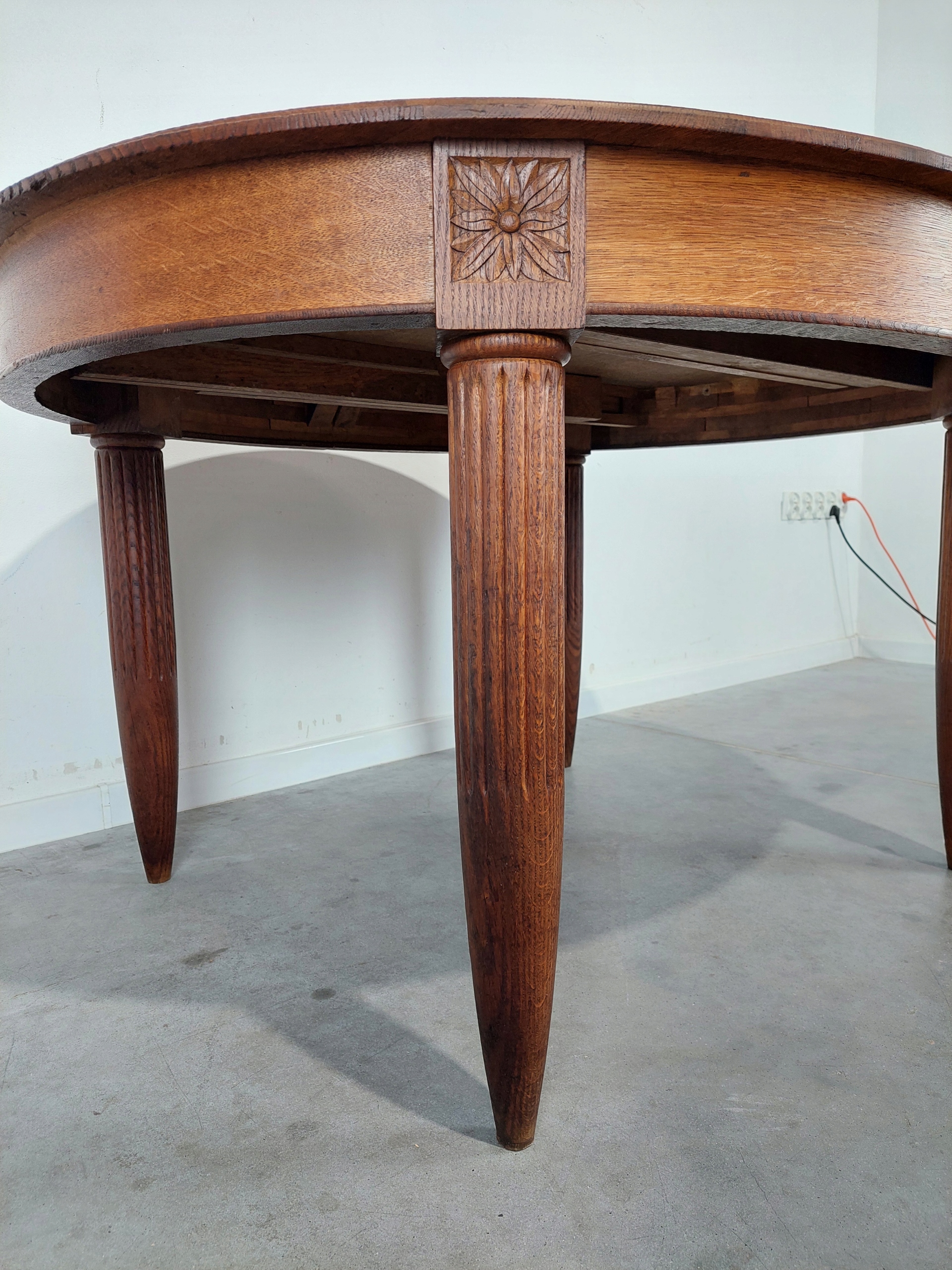 Стильный стол в стиле ар -деко, уникальный, встроенный на красивые сплошные резные ноги. Целое сделано из твердого дуба. На столешнице коммерческие функции / ссадины или обесцвечивание (из -за возраста). В таблице есть возможность распространять, но у нас нет продления вставки. Стабильная и твердая мебель. Подробности на картинках ниже. (Таблица идет к клиенту полностью).