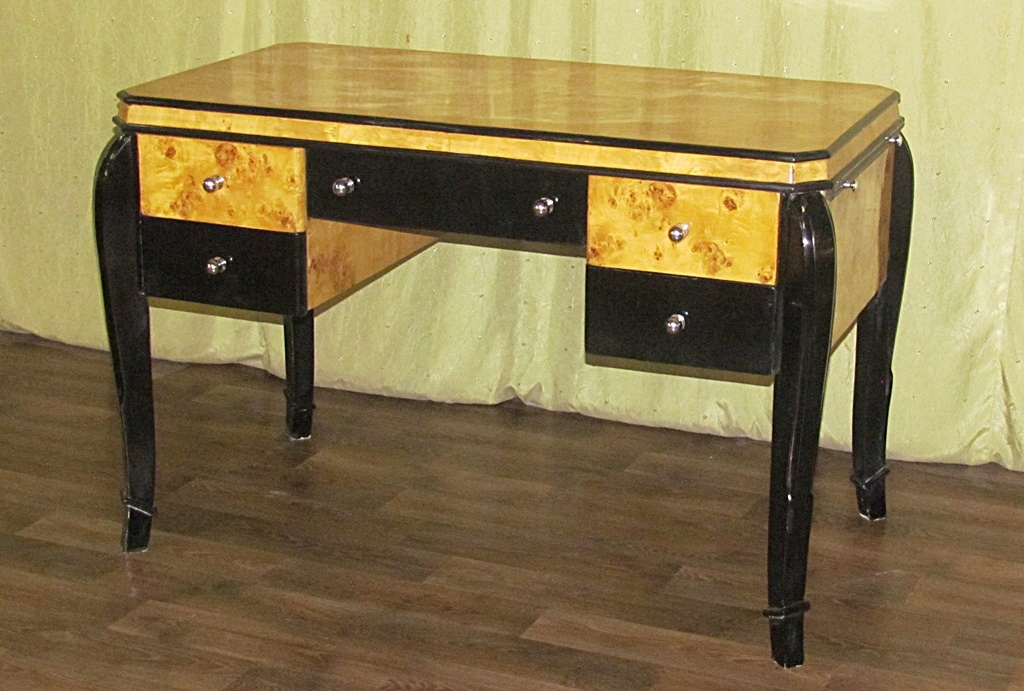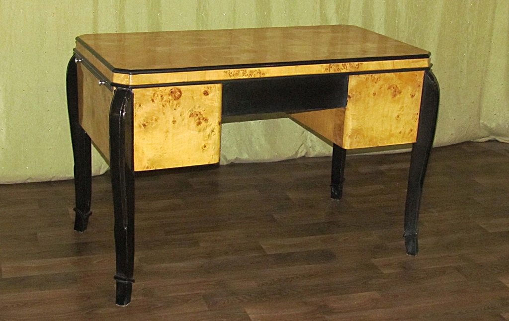 Письменный стол новый, современно выполненный в старинном стиле, сохранивший все характерные для этого стиля формы. Материал: 100% светлая древесина ореха в сочетании с черным и фантастическим оригинальным рисунком зерен. Он имеет большой ящик посередине и два поменьше справа и слева. Интересной особенностью являются боковые столешницы - помощники, которые можно выдвигать при необходимости.