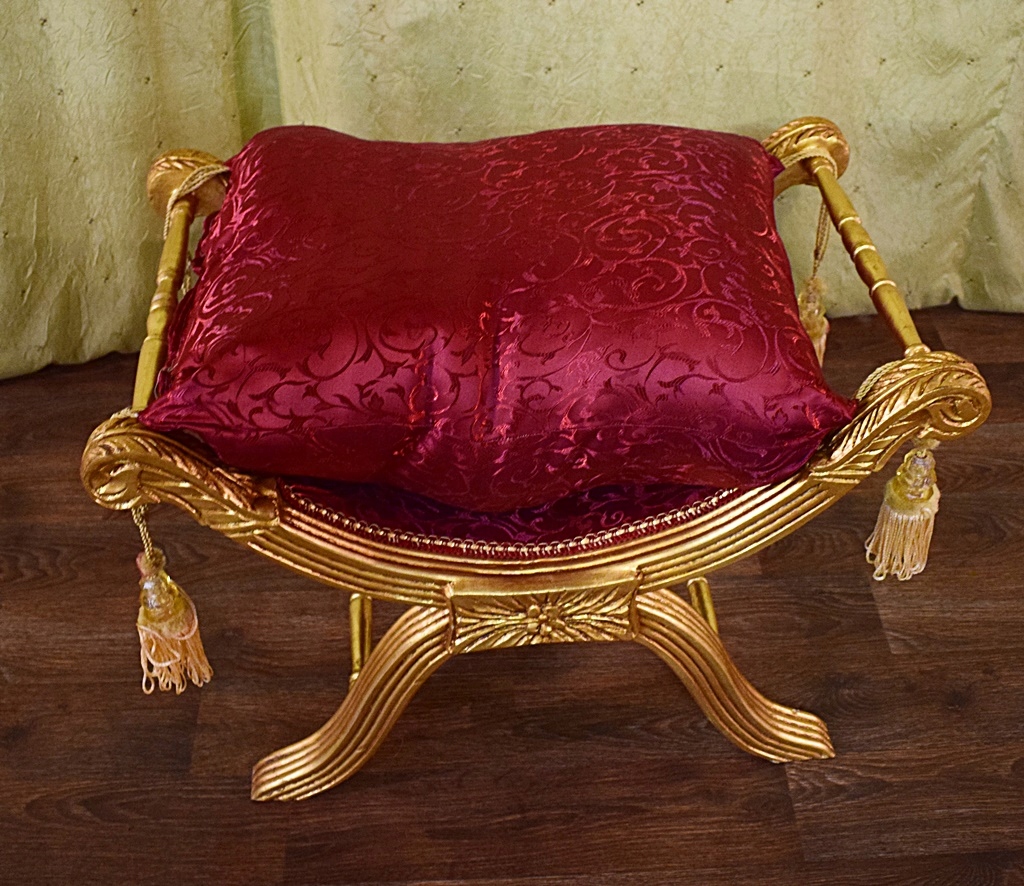 Стильный зиделек - сиденье, выполненное в современном стиле. Деревянная мебельная конструкция, тонко вырезанная по всей поверхности темно-золотым цветом. Подушка изготовлена из бордового материала с нежным растительным узором, отделана декоративной бахромой по углам. Его можно использовать в качестве сиденья в прихожей при переобувании, в ванной при пользовании туалетом или как дополнительное место в гостиной, когда приходит больше гостей.