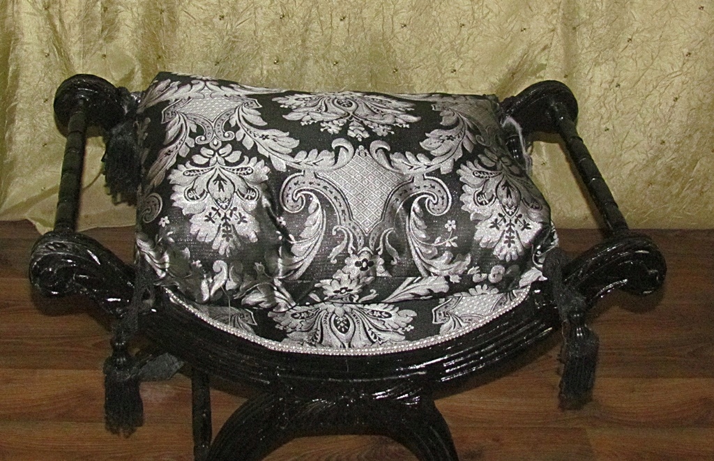 Стильный зиделек - сиденье, выполненное в современном стиле. Деревянная мебельная конструкция, тонко вырезанная по всей поверхности черного цвета. Подушка изготовлена из черного материала с цветочным мотивом, отделана декоративной бахромой по углам. Его можно использовать в качестве сиденья в прихожей при переобувании, в ванной при пользовании туалетом или как дополнительное место в гостиной, когда приходит больше гостей.