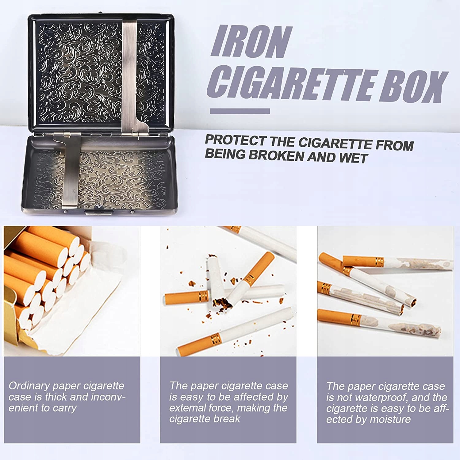 Размер портсигара EYIDADAE: 104,5 мм х 84,5 х 19,5 мм, вес всего 3,53 унции, портсигар фиксируется парой Подпружиненные зажимы для удержания сигарет, внутренний слой отсеков, легко вмещают 20 сигарет длиной сигареты 100 мм. 2. Металлический портсигар EYIDADAE легкий и портативный, его можно легко положить в различные карманы или сумки, прочный металлический материал защищает сигареты и другие предметы от раздавливания и хранения вдали от влаги. 3. Портсигар EYIDADAE имеет конструкцию пружинной кнопки, портсигар легко открывать и закрывать, кнопку переключателя можно открыть одним касанием, можно поделиться с кем угодно 4. Портсигар EYIDADAE представляет собой высококачественный металлический портсигар и красивый внешний вид. , идеально подходит в качестве подарка любимому человеку или друзьям.