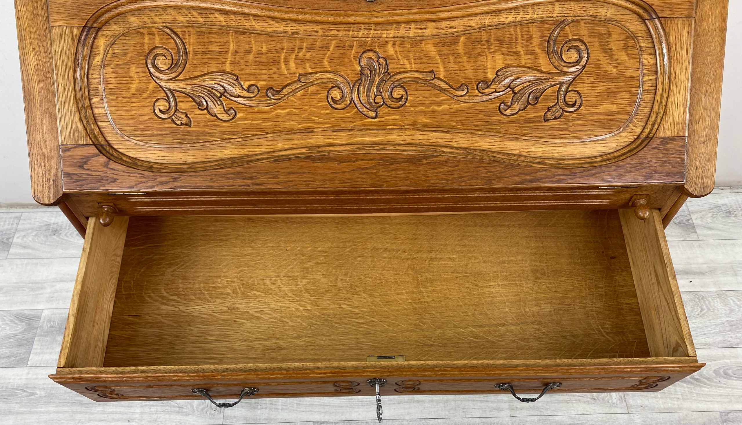 Секретарь имеет открывающуюся створку, под ней 3 ящика.