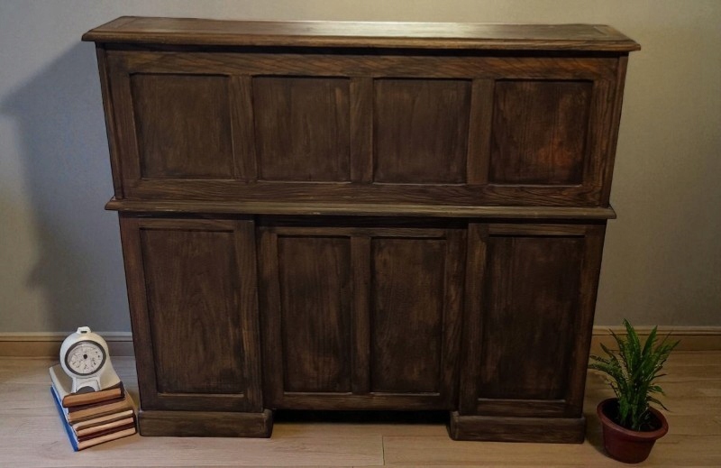 мебель сделана с вниманием к деталям от дуба. Верхняя часть с разными полками и связующими закрыта слепой, ниже вершины семи ящиков. Цвет сохранился в тоне темного деревенского дуба. Я оцениваю состояние, несмотря на годы (около 60-70) очень хороших; На мой взгляд, это не требует реконструкции. h1> Я очень рекомендую !!