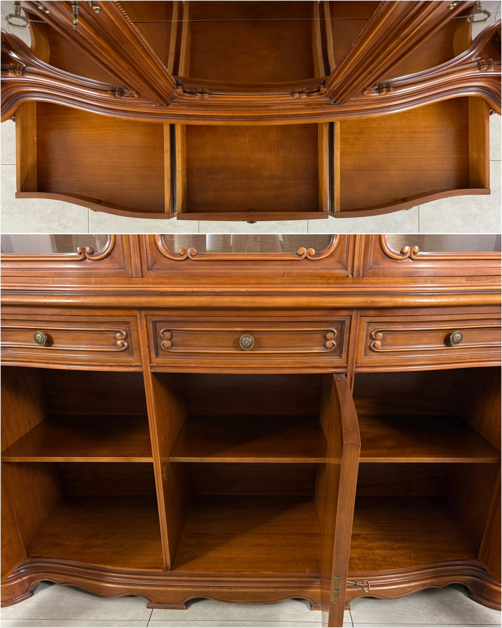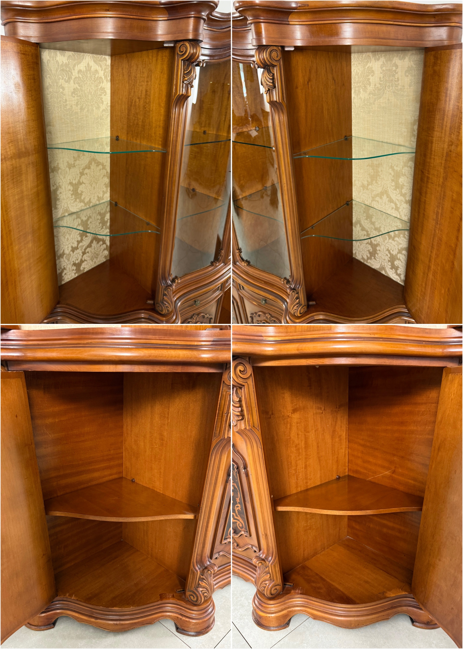 Верхняя, средняя часть – стекло. Полноценные боковые шкафы, украшенные замысловатой резьбой и цветочными инкрустациями. Внутри две стеклянные полки.