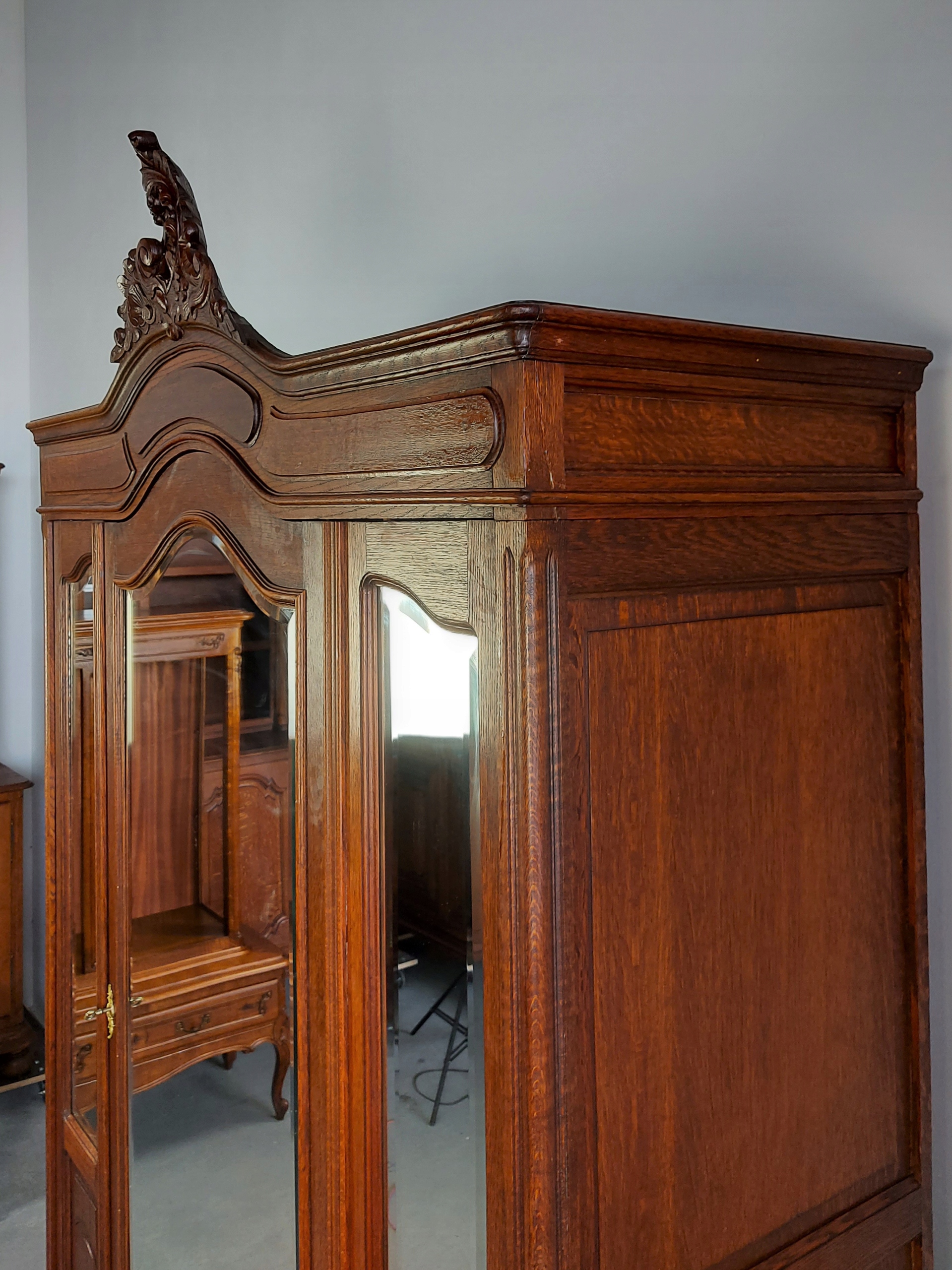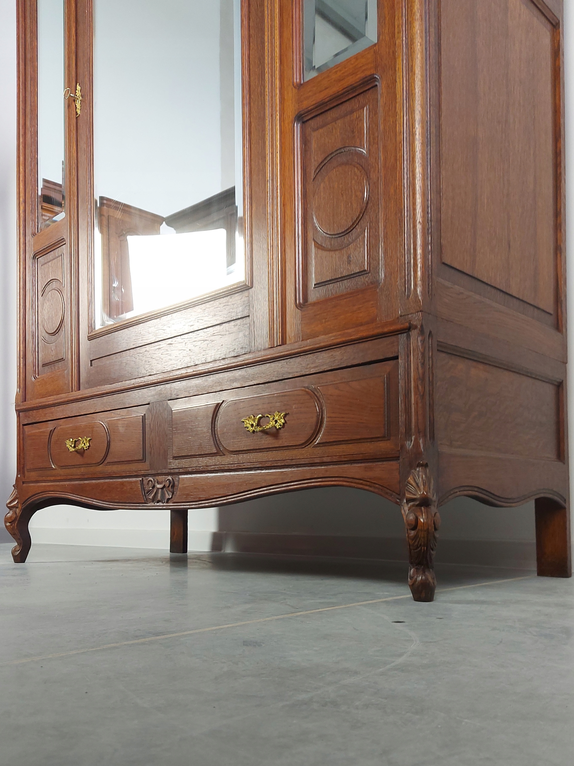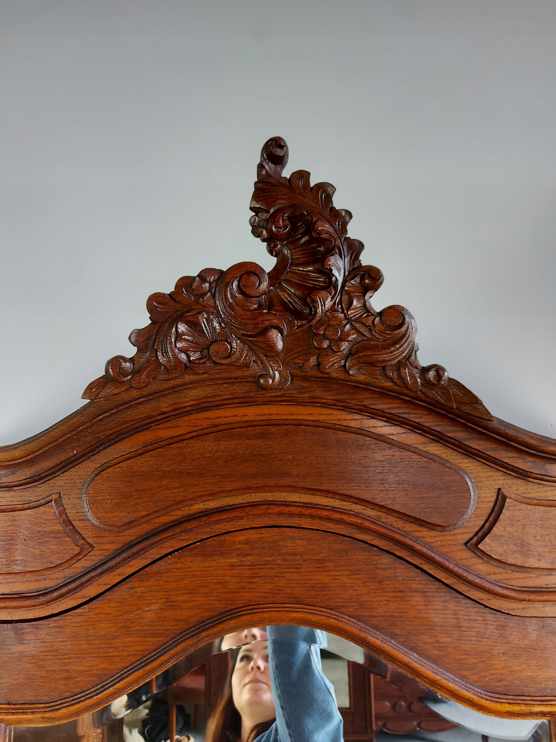 Стильный шкаф в стиле рококо в стиле рокай из древесины дуба. Скошенные хрустальные зеркала в очень хорошем состоянии, учитывая возраст мебели (единичные пятна). Замок работает, ключ в комплекте. Шкаф датирован 1931 годом (подпись видна на последнем фото).Шкаф имеет 3 двери, две двери открытые, третья фиксированная. Внутри имеется металлическая повязка для вешалок. На мебели могут быть следы ремонта (из-за возраста).Шкаф привезен из Франции, для транспортировки разобран. Подробные фото ниже.