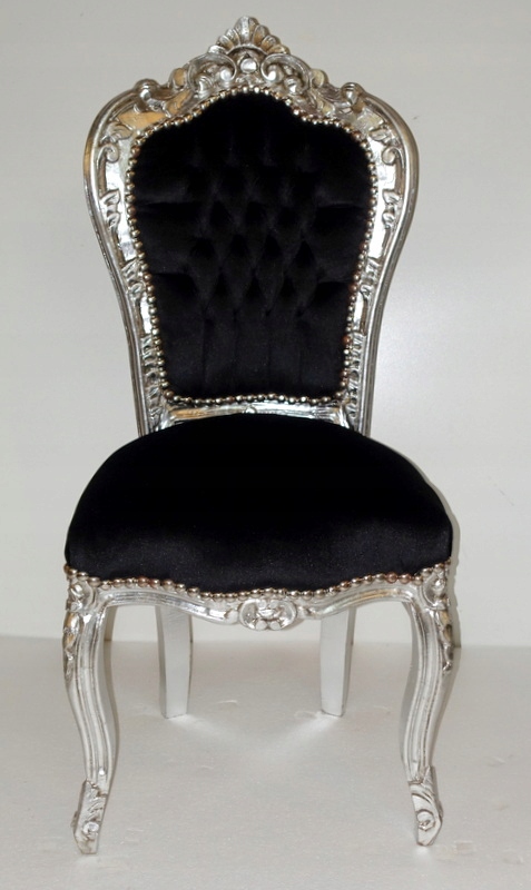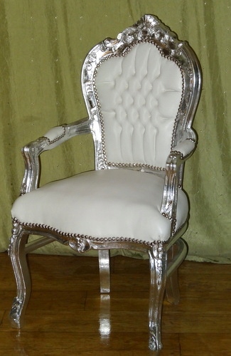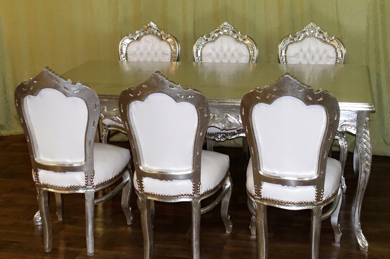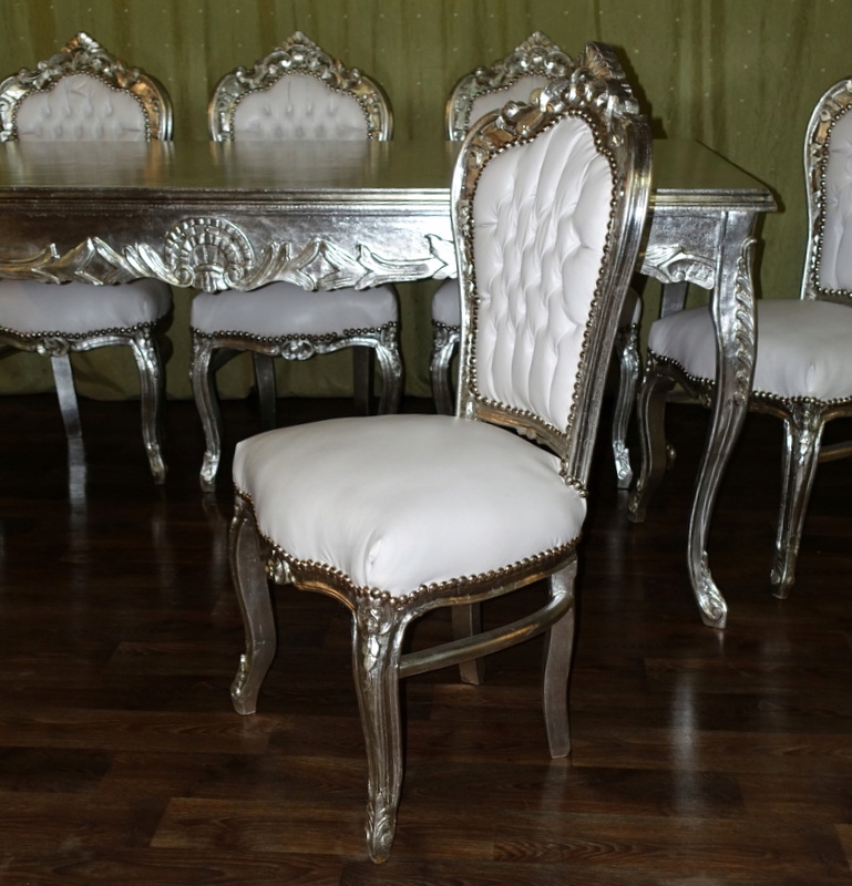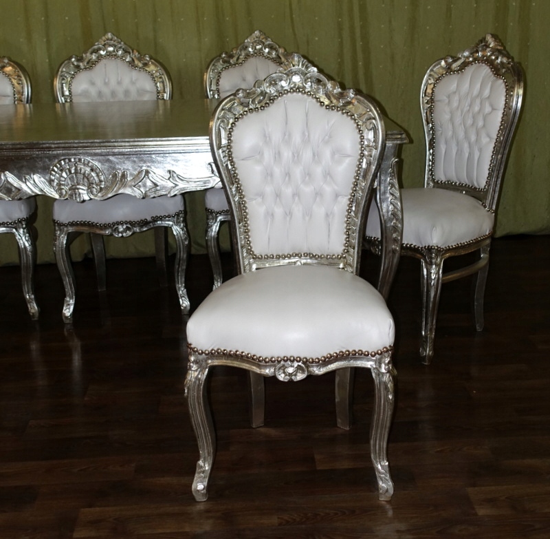 В комплект входят 6 стильных табуретов в стиле барокко, новых, неиспользованных, современно выполненных в старинном стиле, похожих на антикварный предмет мебели. Древесина серебристого цвета, также покрытая серебряными хлопьями. Обивка выполнена из белой экологической кожи, спинка простегана и отделана стильной никелированной булавкой.