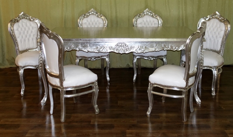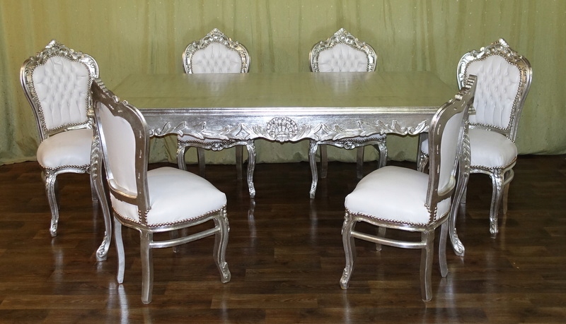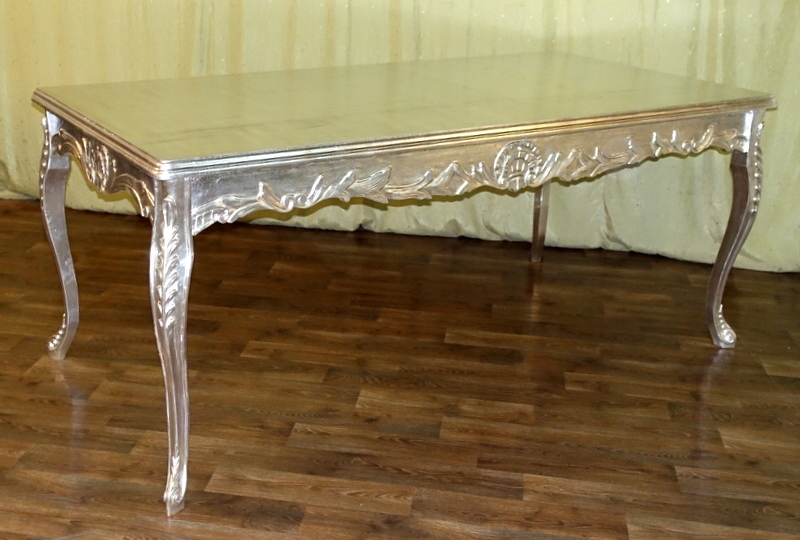 Стол из дерева цвета античного серебра; покрыты серебряными чешуйками шлагметала. Ажурная, тонкая резьба на боковых элементах и стройные, стильно изогнутые ножки придают легкость, несмотря на большие размеры.