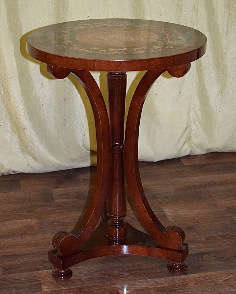 Современный стол, выполненный в старинном стиле. Предмет мебели новый, неиспользованный, цвета темного ореха, а столешница дополнительно украшена живописной инкрустацией - выглядит чрезвычайно очаровательно и наверняка станет полезным и элегантным предметом мебели в любом доме.