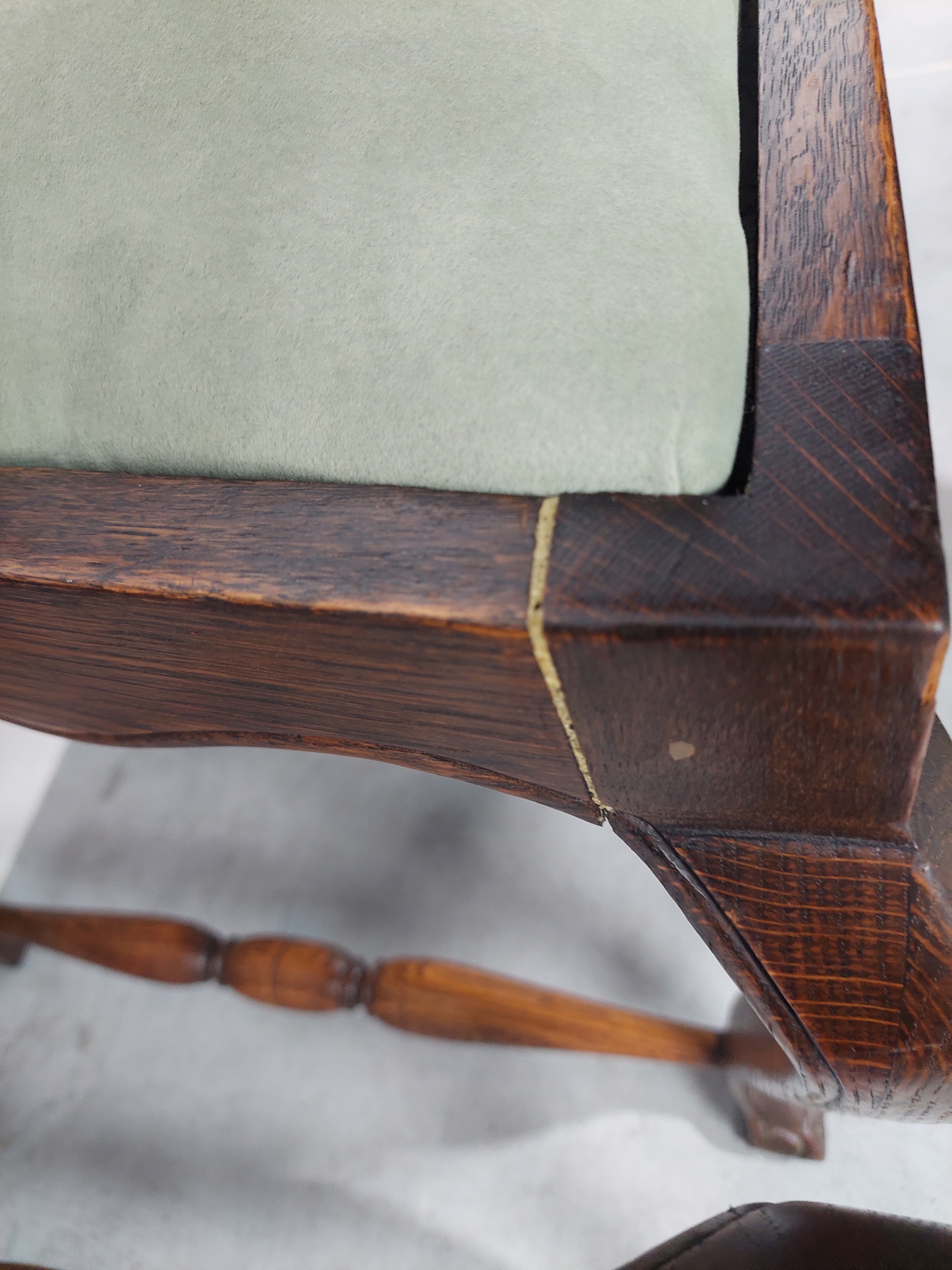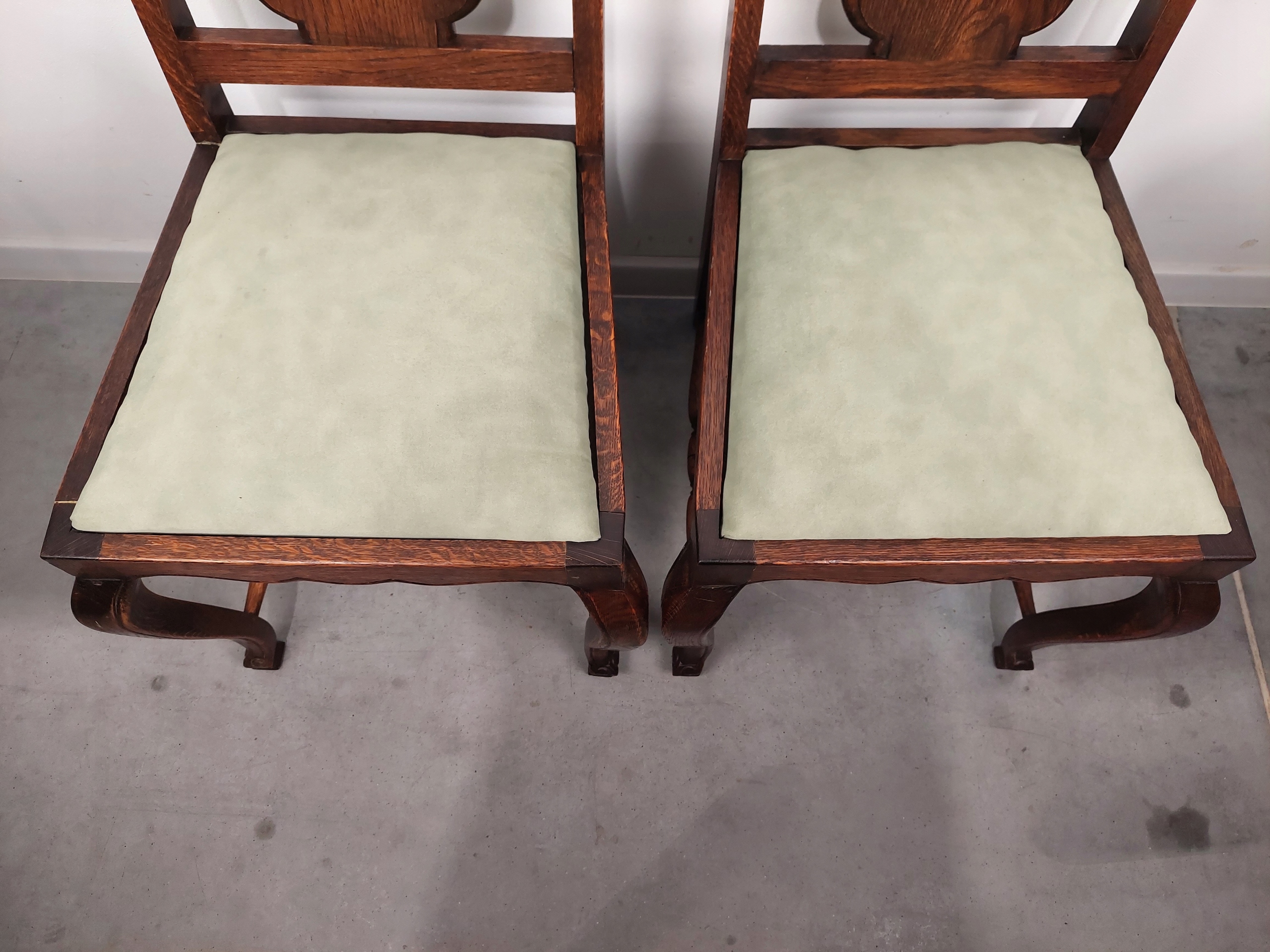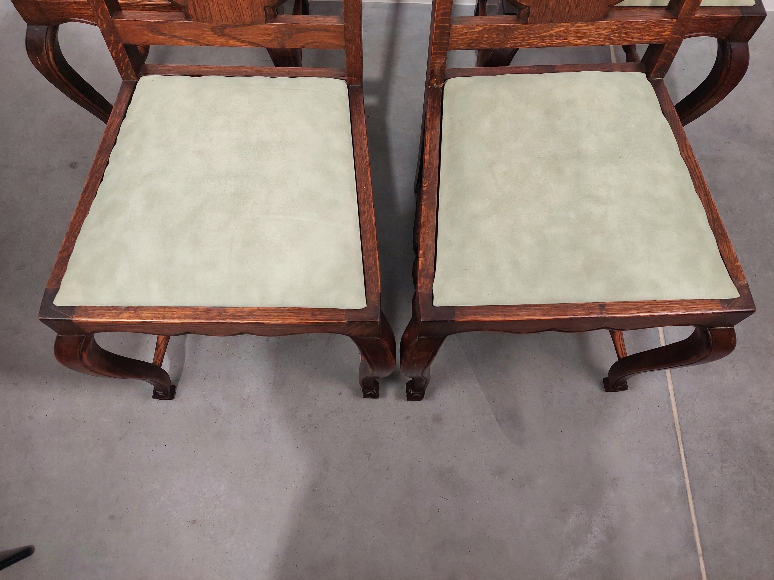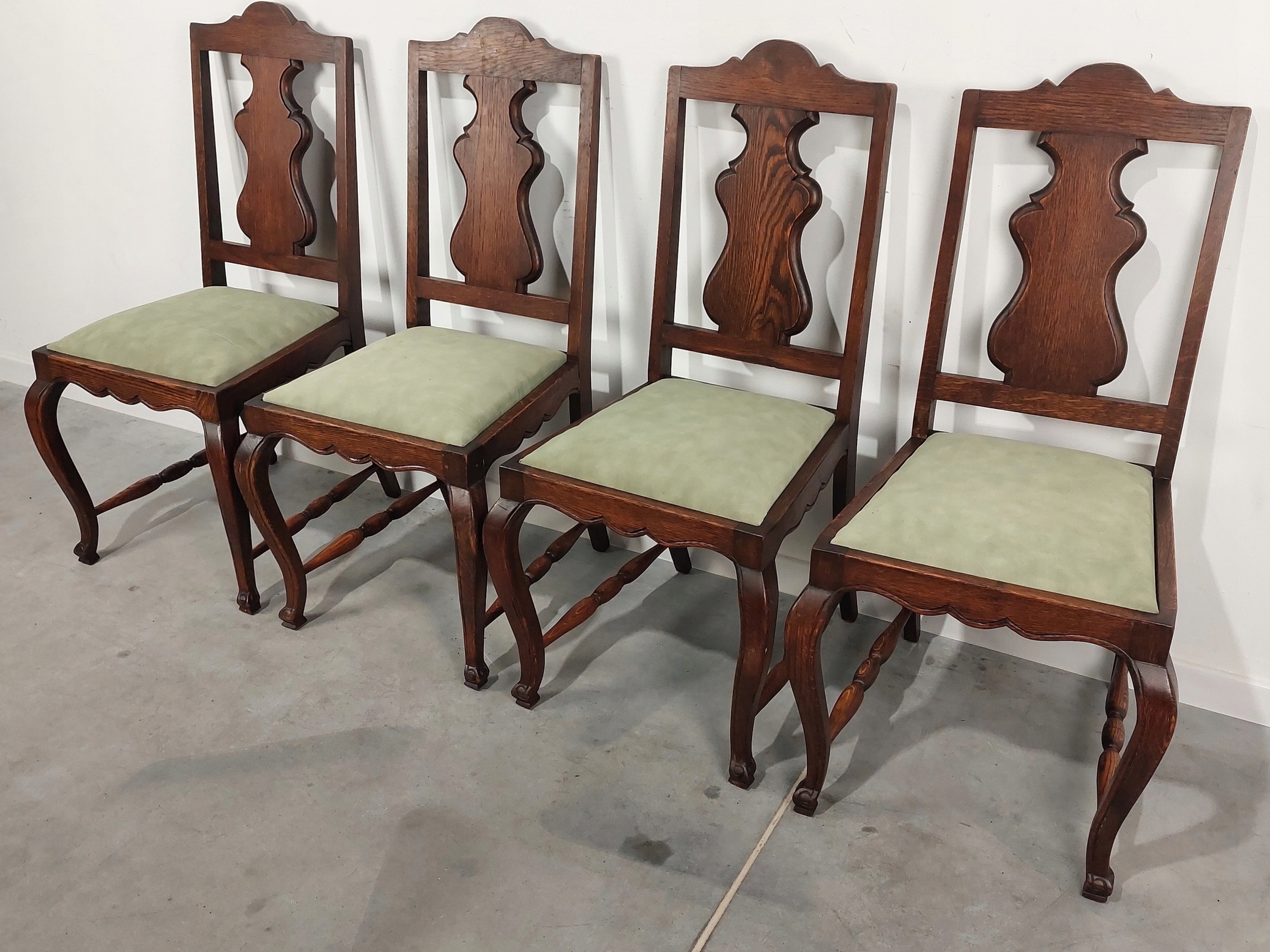 Стильный раздвижной стол Ludwik с 4 стульями. Мебель изготовлена из массива дуба производства Франции. На стульях имеются следы использования, т. е. царапины или изменения цвета, следы ремонта. Стулья и стол устойчивые, обивка из бархата фисташкового цвета, выглядит как новая, без дыр и потертостей. Цена указана за комплект. стол и 4 стула. Подробности показаны на фотографиях ниже.