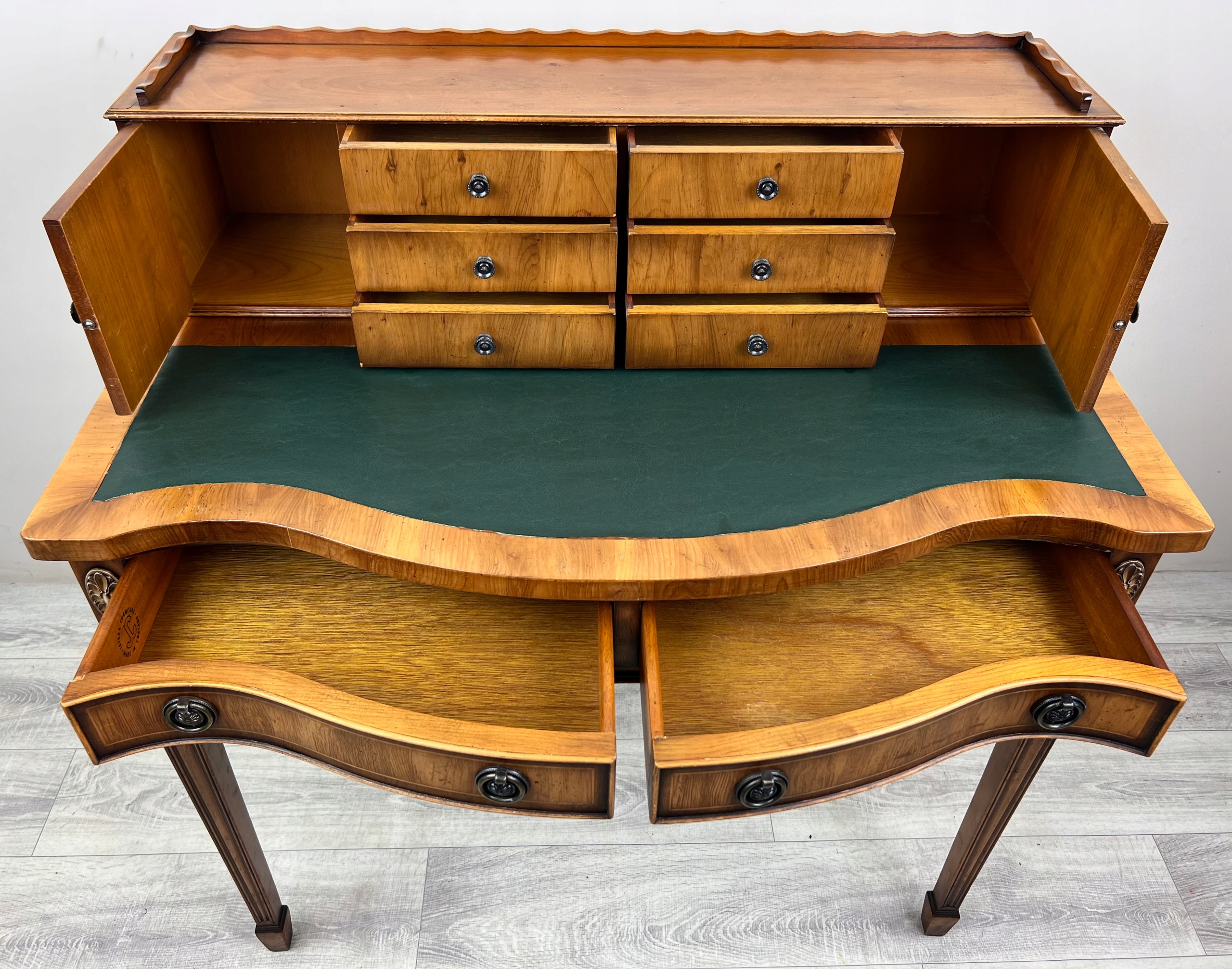 Столешница обтянута кожей. Предмет мебели с многочисленными ящиками и двумя распашными дверцами.