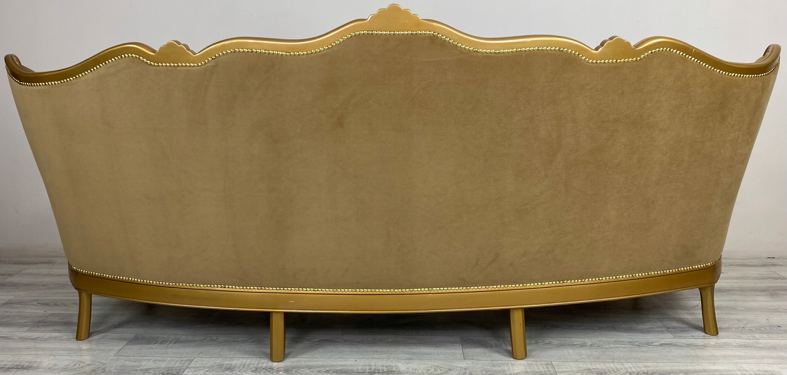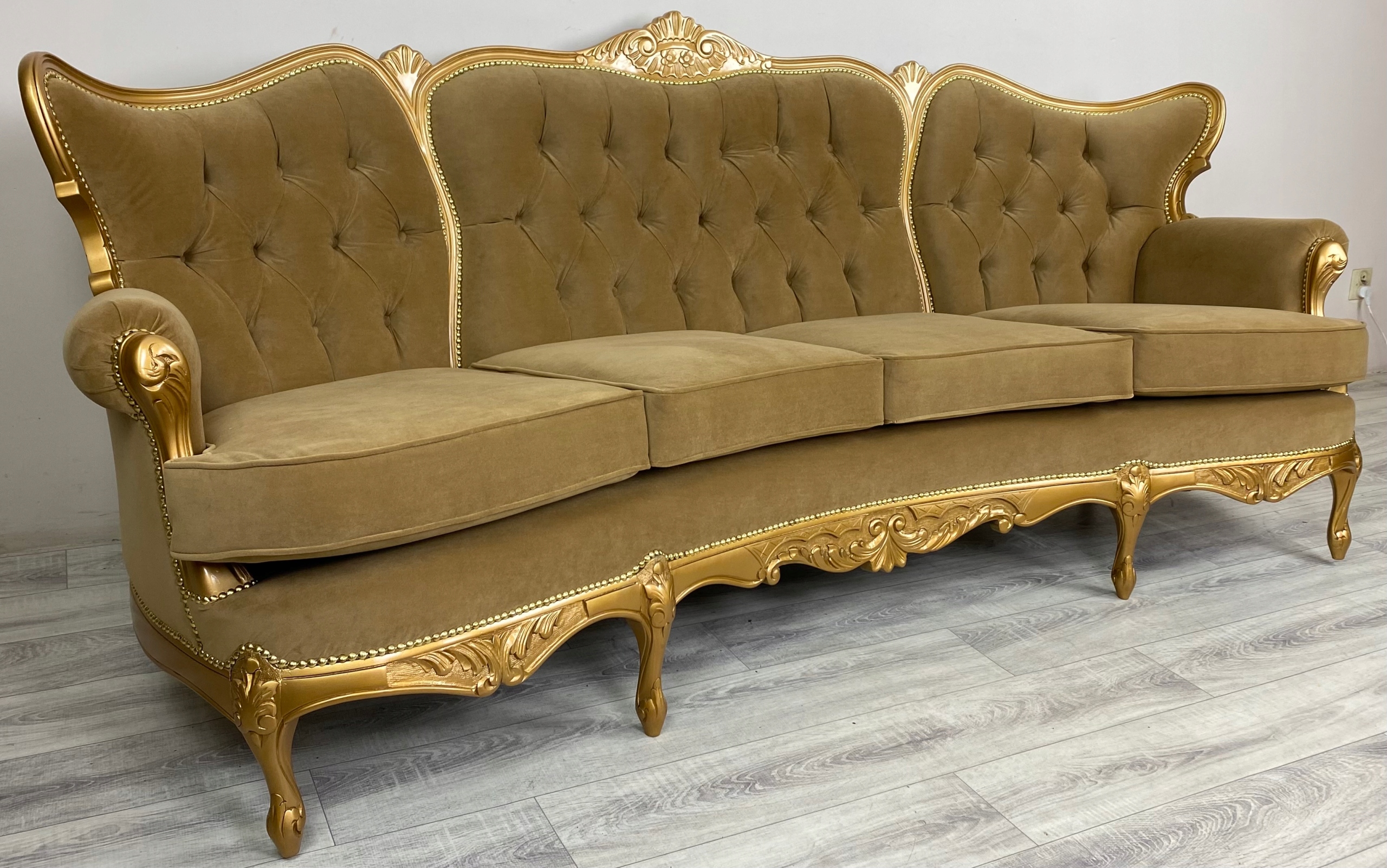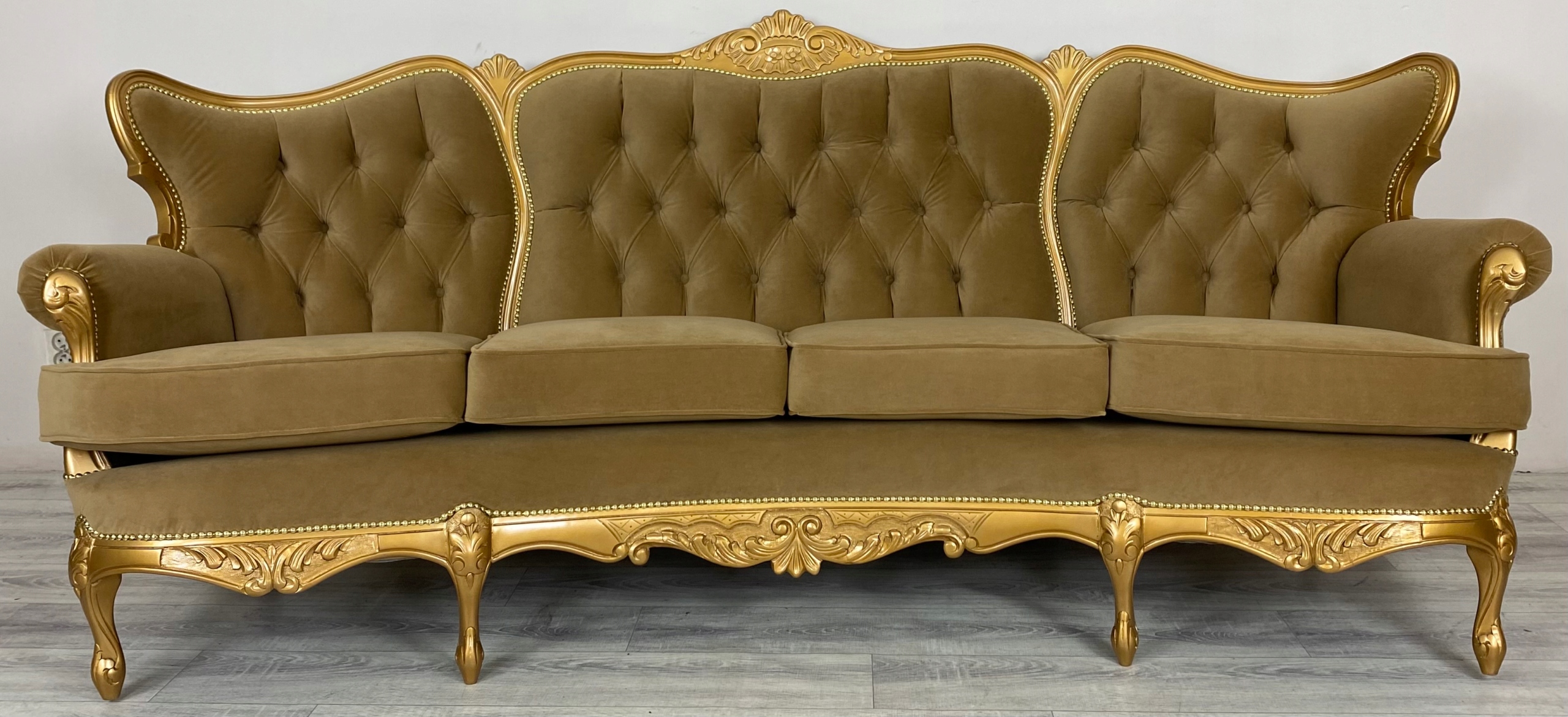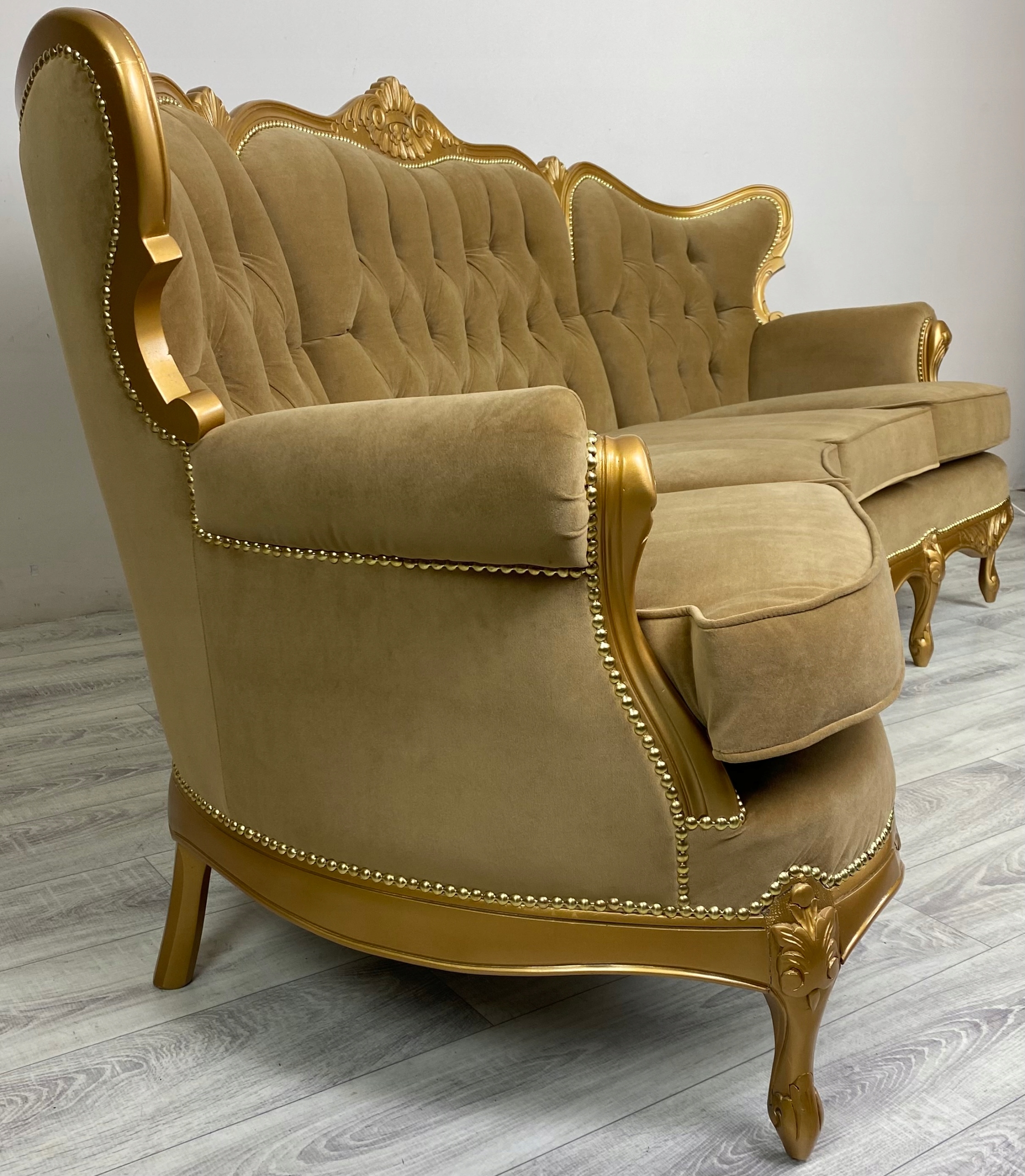 диван и сиденья, покрытые новой, велюровой бежевой обивкой.