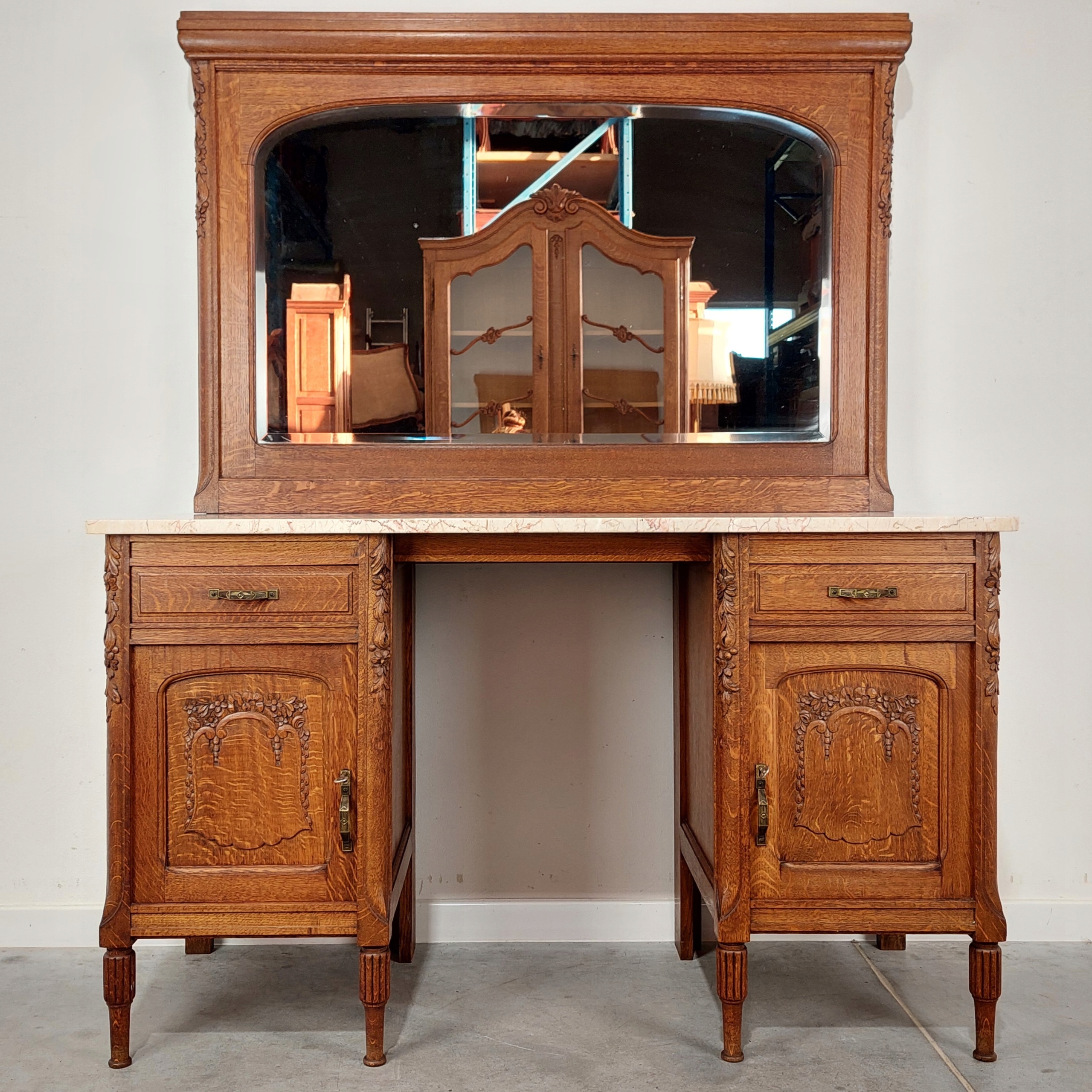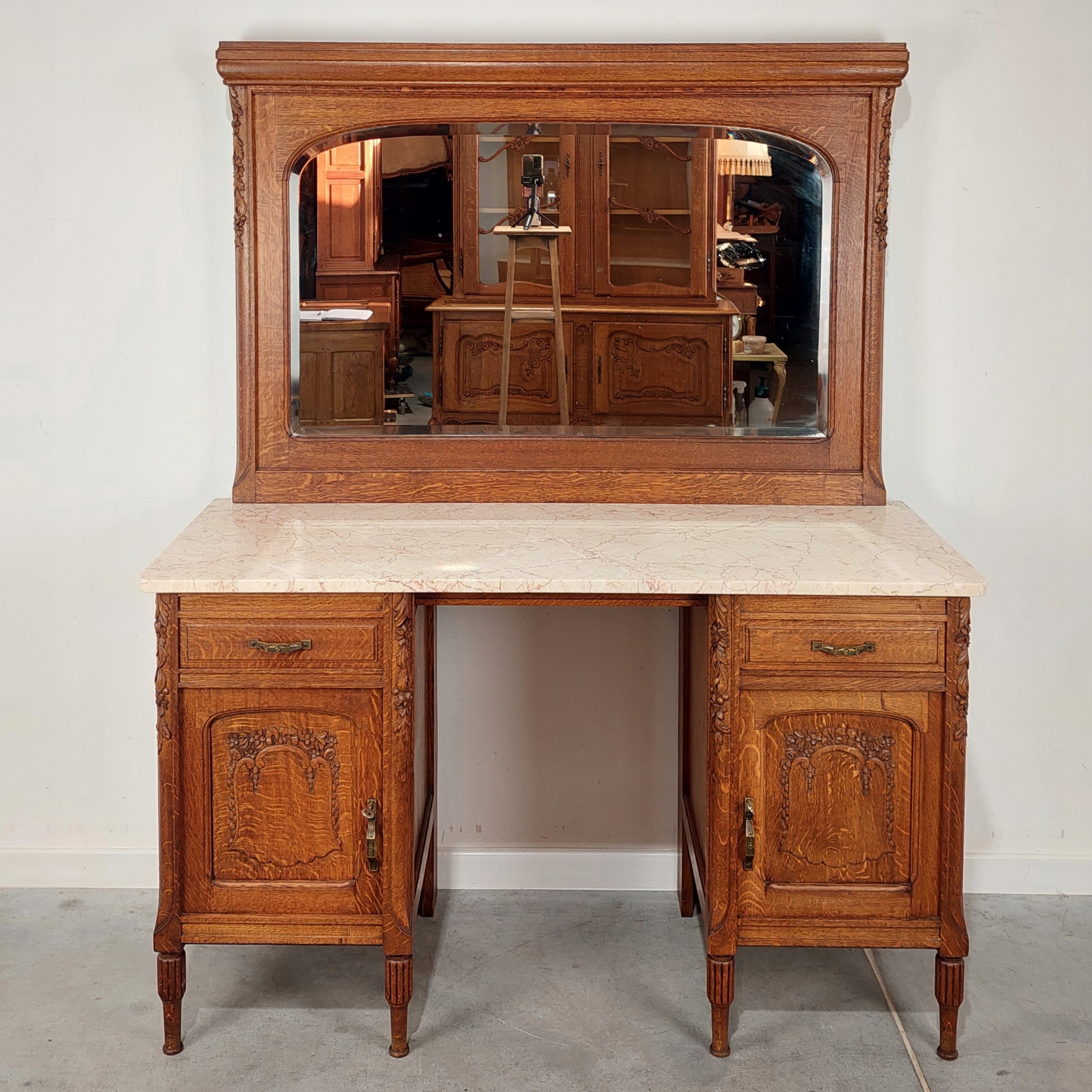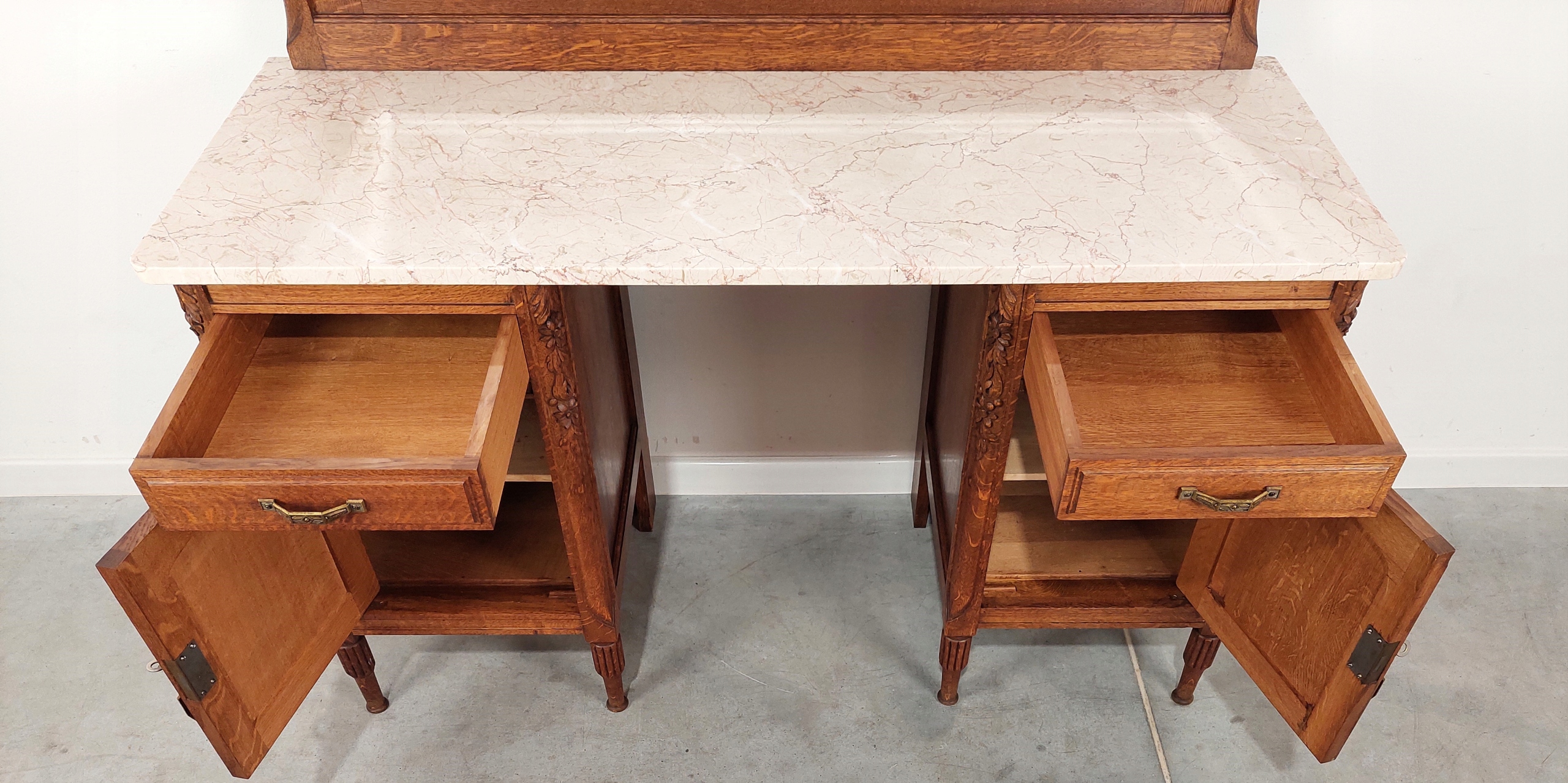 Стильный дубовый туалетный столик/сервант в стиле ар-деко с зеркалом и мраморной столешницей. Дата производства 1933 г. (есть идентификационный номер). Мебель из массива дуба, с красивой резьбой. Столешница представляет собой каменную плиту со следами использования, т.е. царапинами, потертостями, двумя дырками (скорее всего от пристройки). Дверные замки работают, в комплекте 2 ключа. Хрустальное зеркало со скошенной кромкой, в отличном состоянии. Мебель имеет следы использования и в силу возраста может иметь следы ремонта. Для транспортировки зеркало откручивается. Подробности показаны на фотографиях ниже.