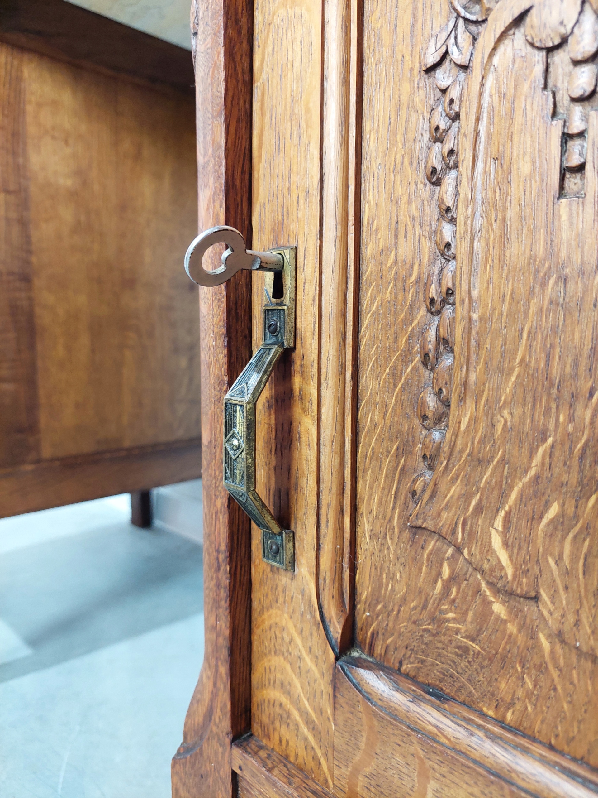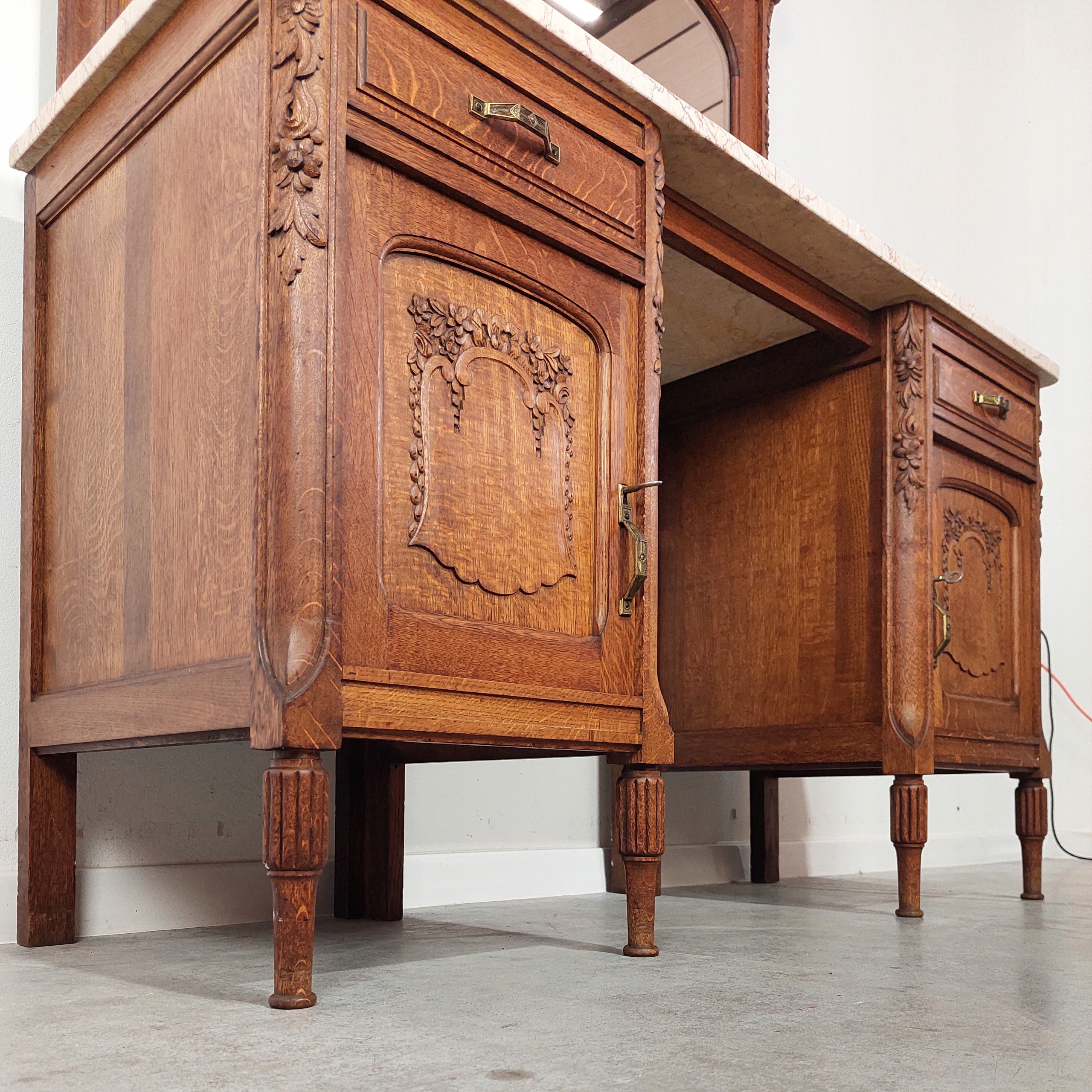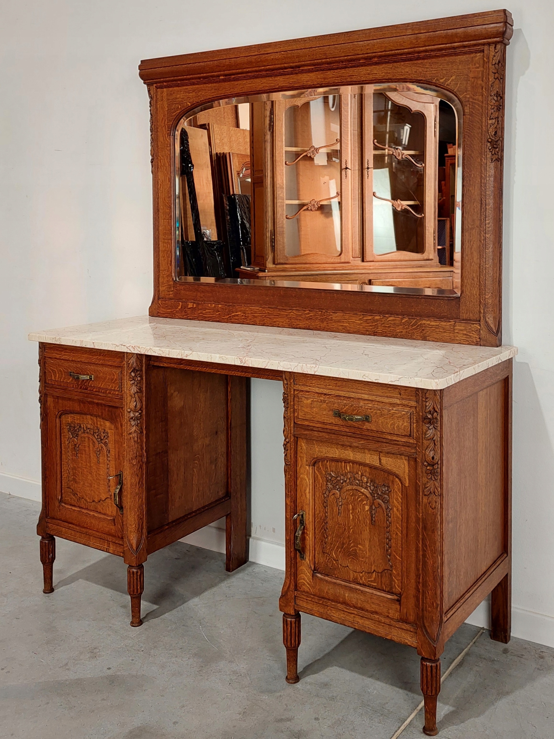 Стильный дубовый туалетный столик/сервант в стиле ар-деко с зеркалом и мраморной столешницей. Дата производства 1933 г. (есть идентификационный номер). Мебель из массива дуба, с красивой резьбой. Столешница представляет собой каменную плиту со следами использования, т.е. царапинами, потертостями, двумя дырками (скорее всего от пристройки). Дверные замки работают, в комплекте 2 ключа. Хрустальное зеркало со скошенной кромкой, в отличном состоянии. Мебель имеет следы использования и в силу возраста может иметь следы ремонта. Для транспортировки зеркало откручивается. Подробности показаны на фотографиях ниже.