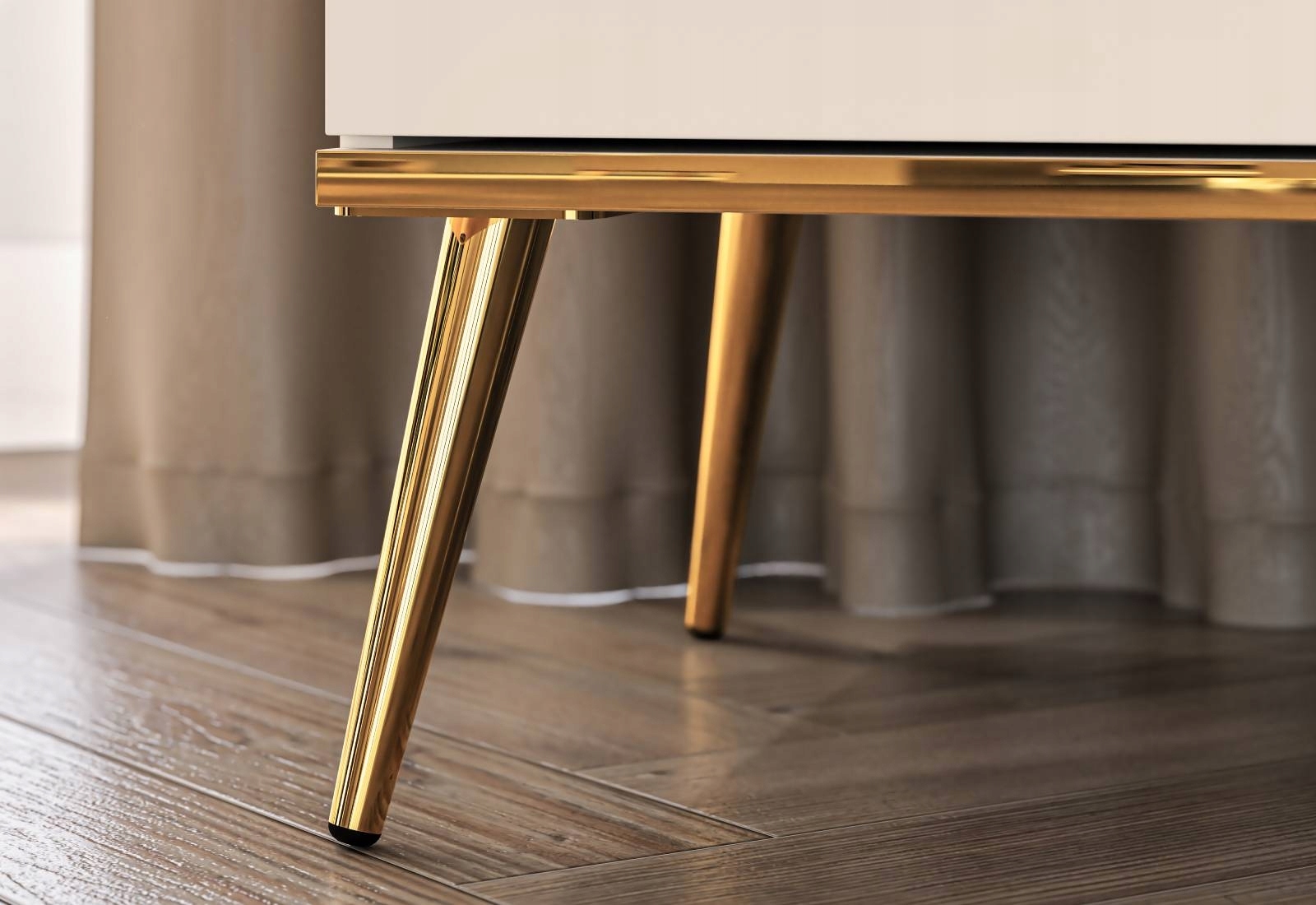 Мебель отличается уникальным дизайном, сочетающим минималистическую форму с элегантными золотыми акцентами. Светло-бежевый, кашемировый декор мебели в сочетании с золотыми ручками, ножками и шпоном нижнего бортика создают гармоничное целое, прекрасно вписывающееся в современные интерьеры. Эта мебель отлично подойдет как в гостиной, так и в уютной спальне.