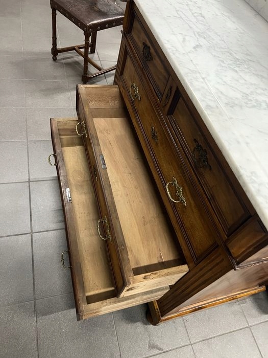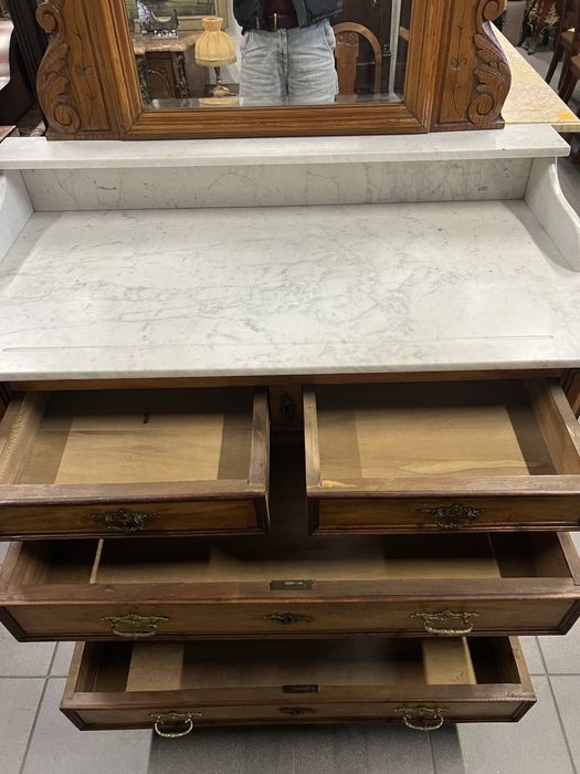 Тема продажи - хороший стильный туалетный столик с мраморным топом. Очень хорошее общее состояние. Весь мрамор, зеркало понизилось по бокам, но имеет сияние от зеркальной стороны покрытия, из -за течения времени.