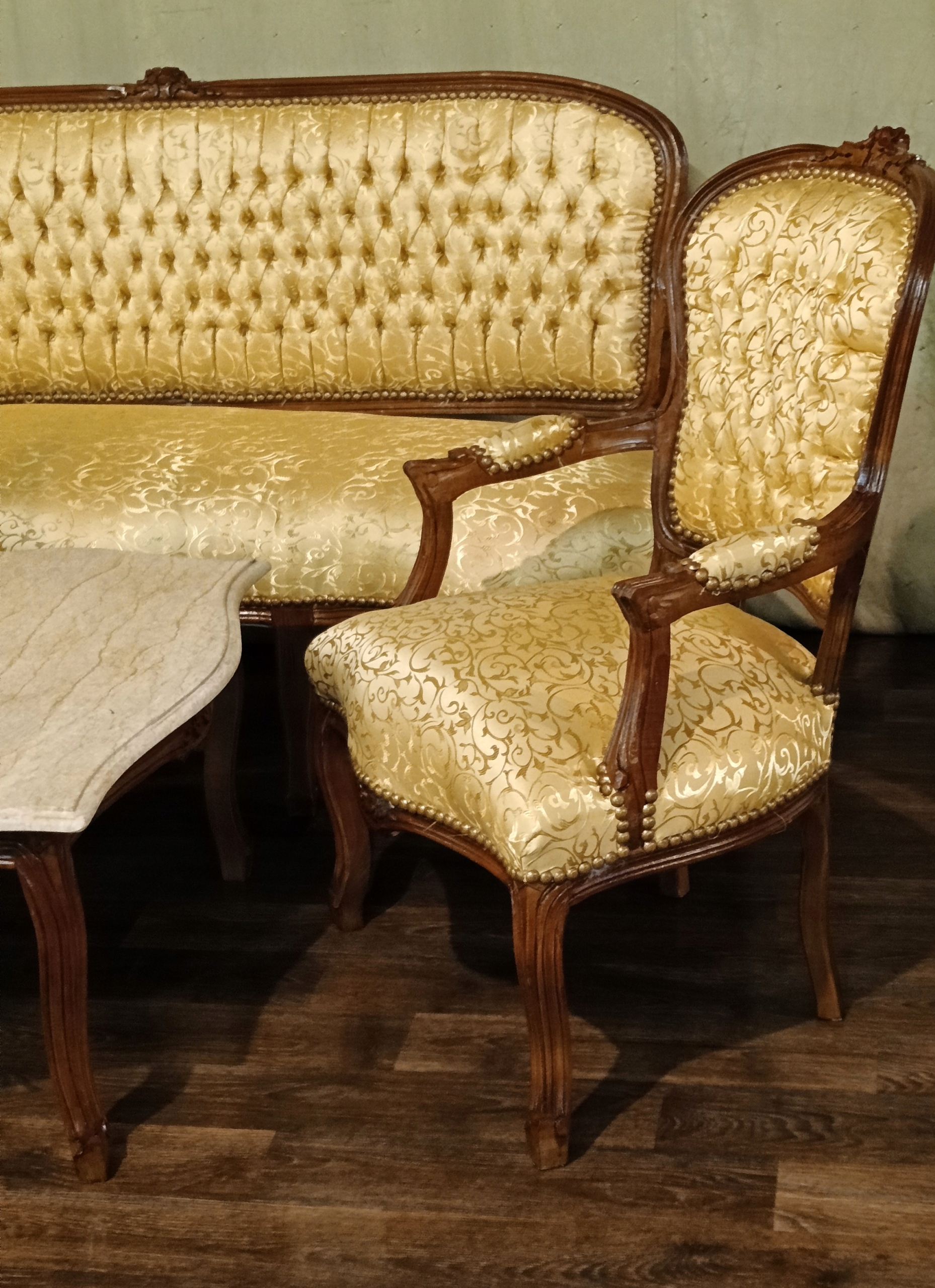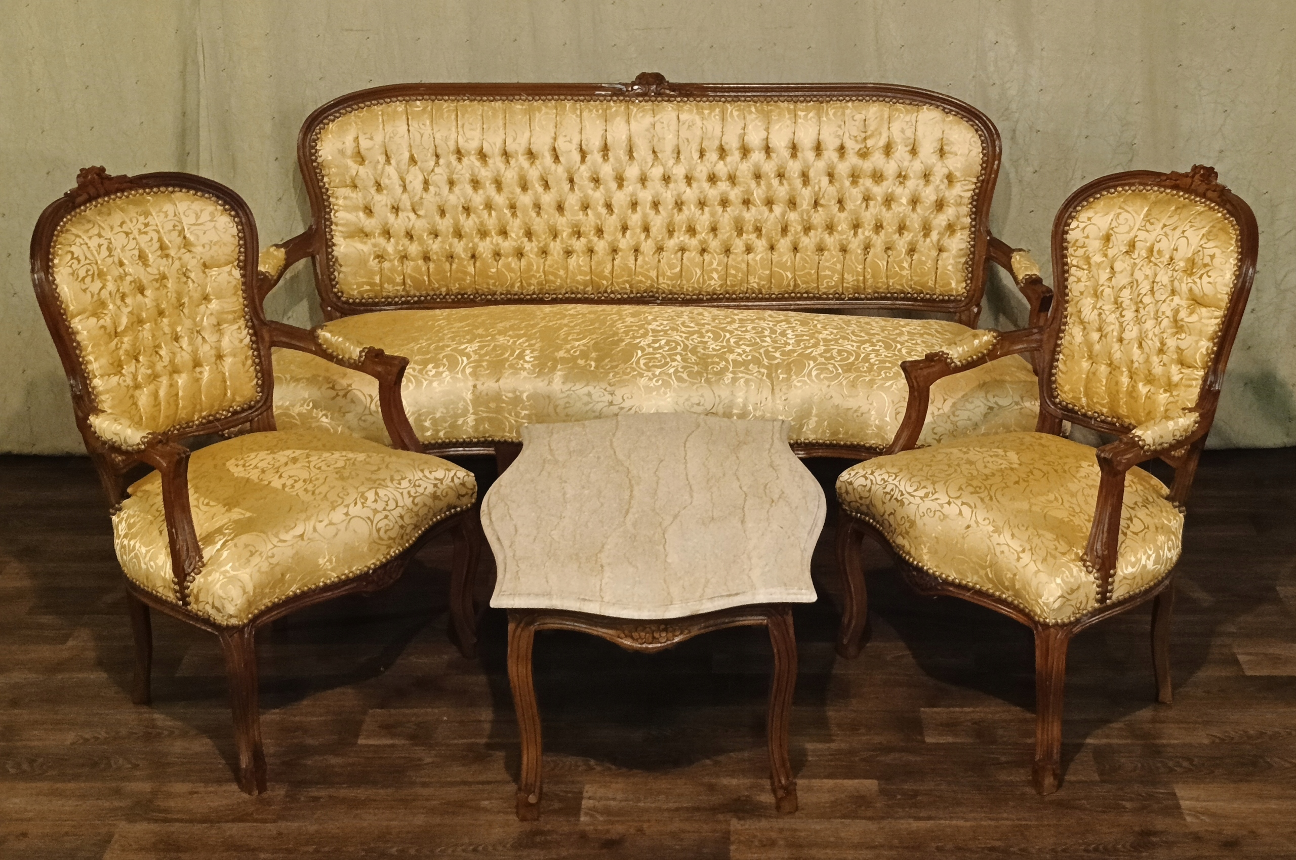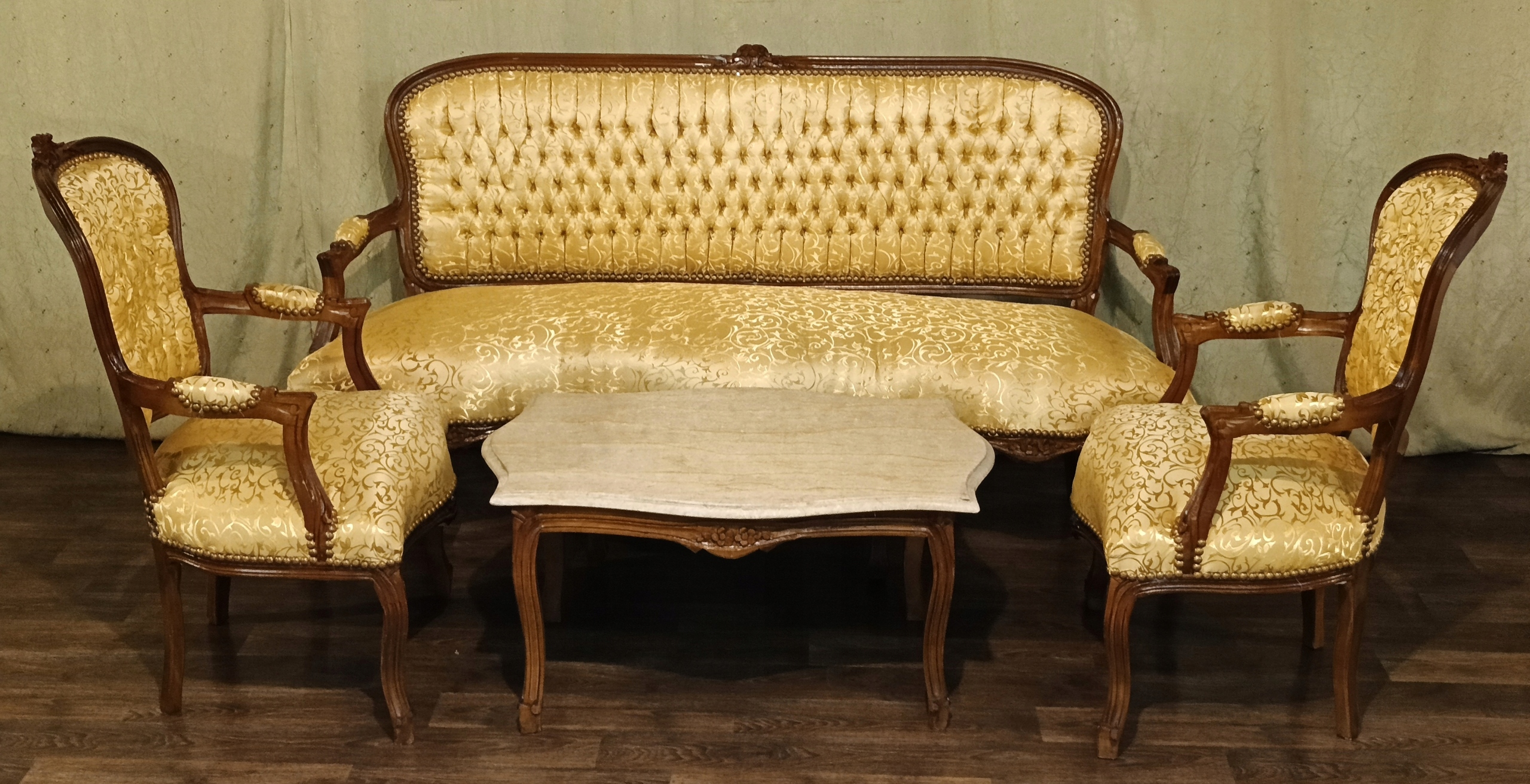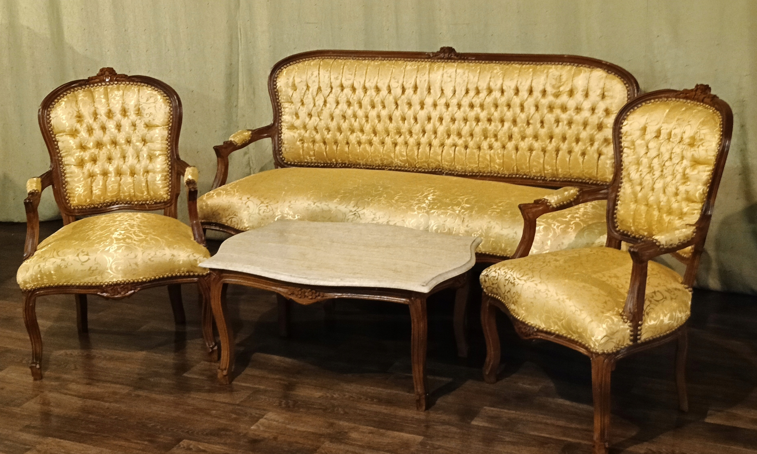 В комплект входят: диван, два кресла и журнальный столик со столешницей из мрамора песочного цвета. Древесина темного ореха. Обивка из материала золотистого цвета с нежным растительным орнаментом, переливающимся в зависимости от угла падения света; отделана изящной латунной булавкой - очень хорошее состояние.