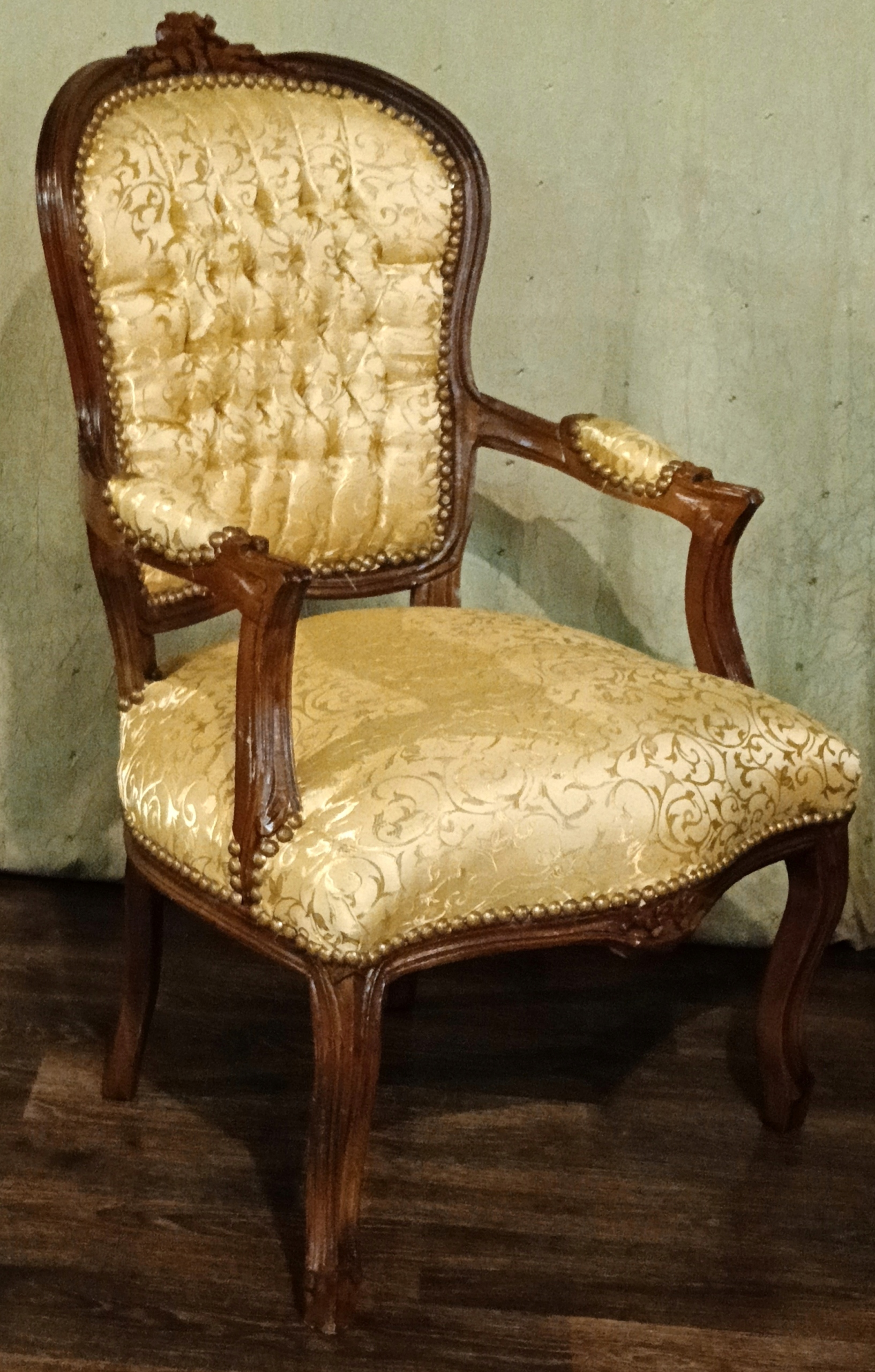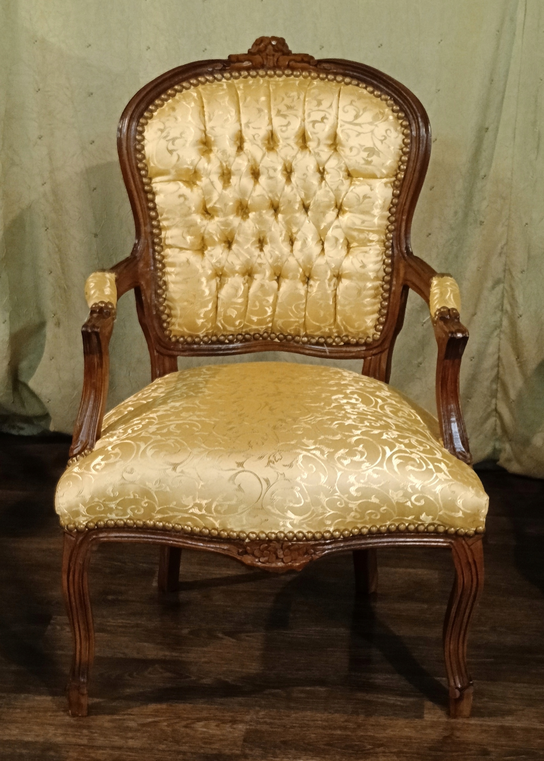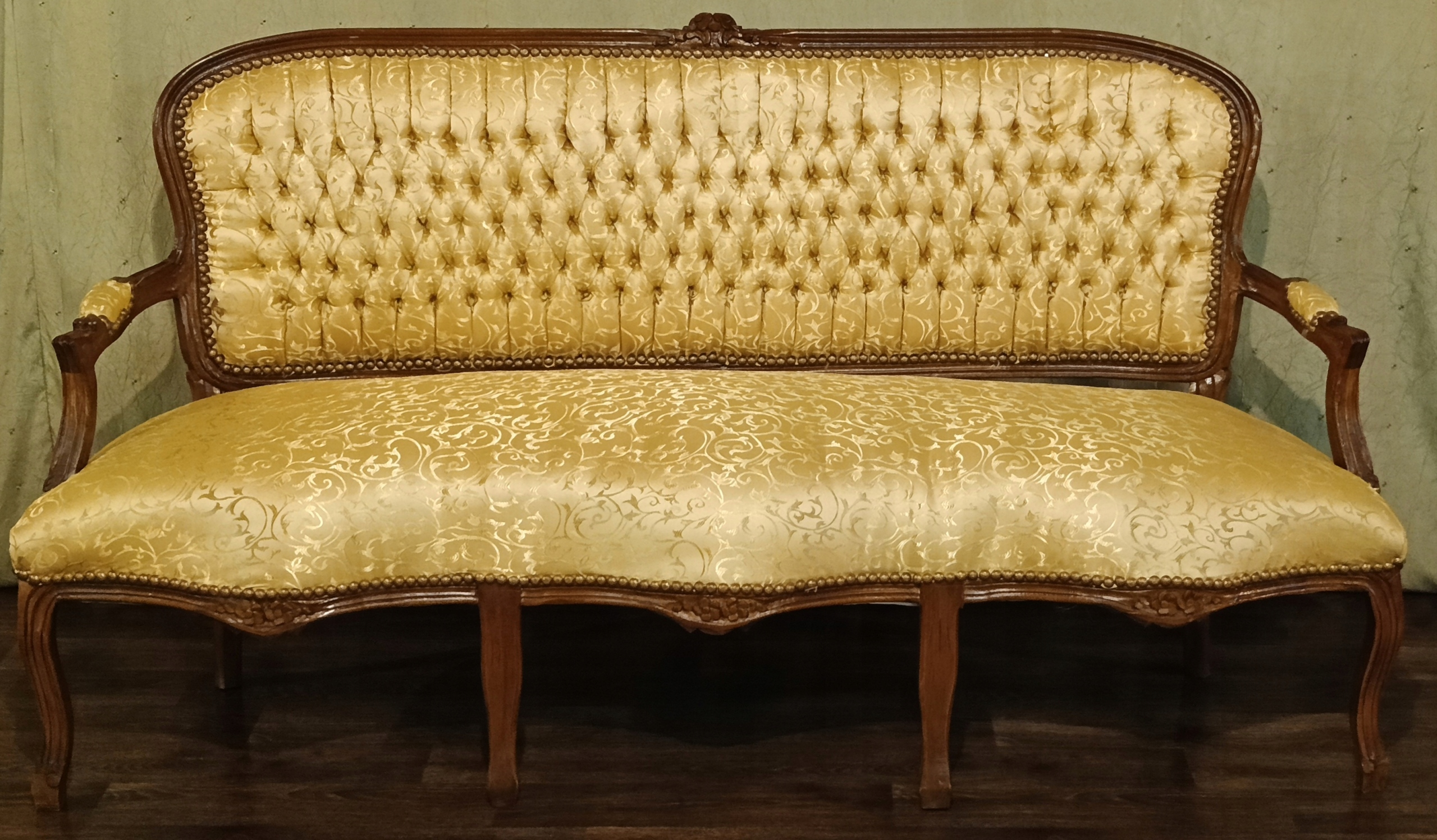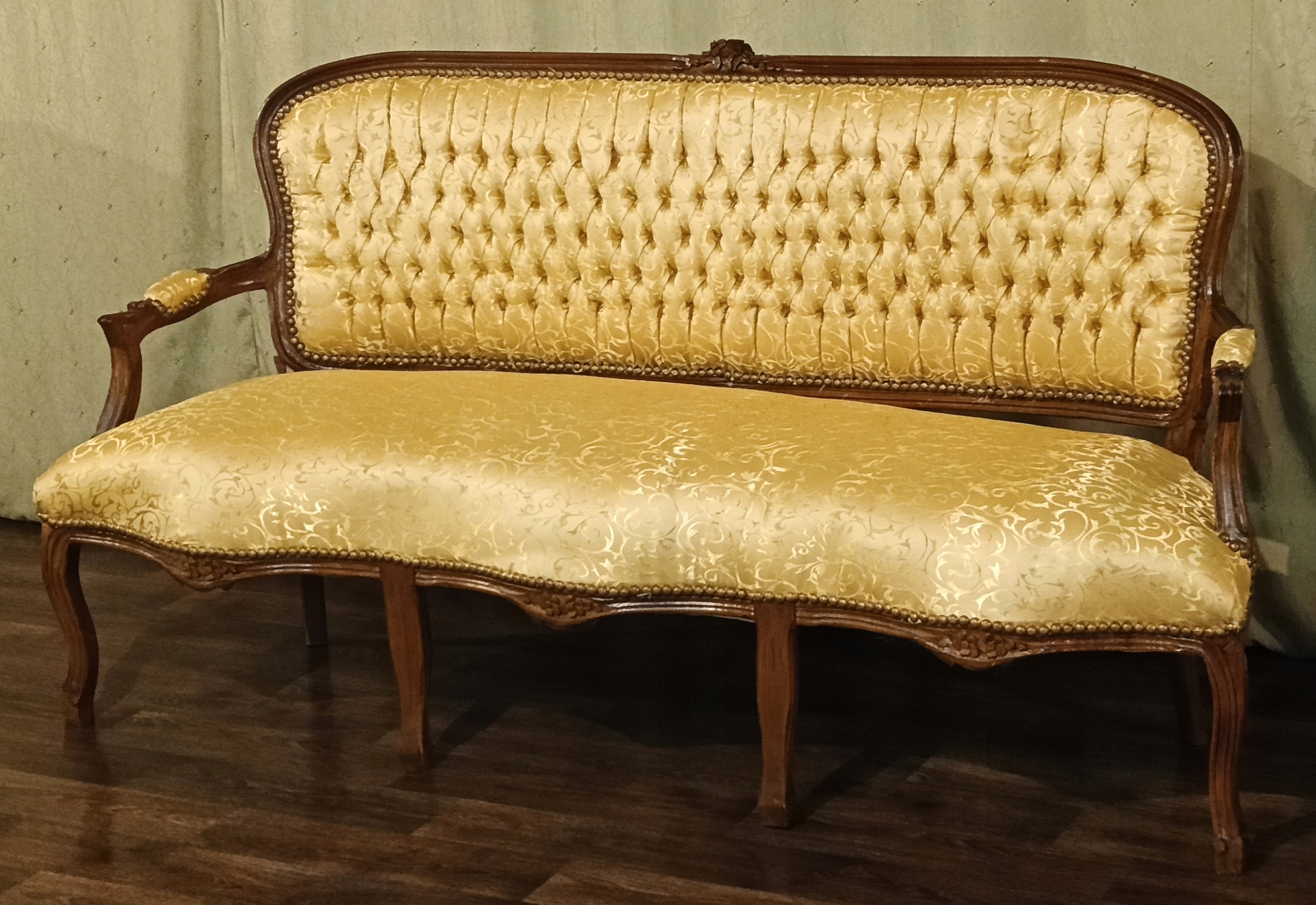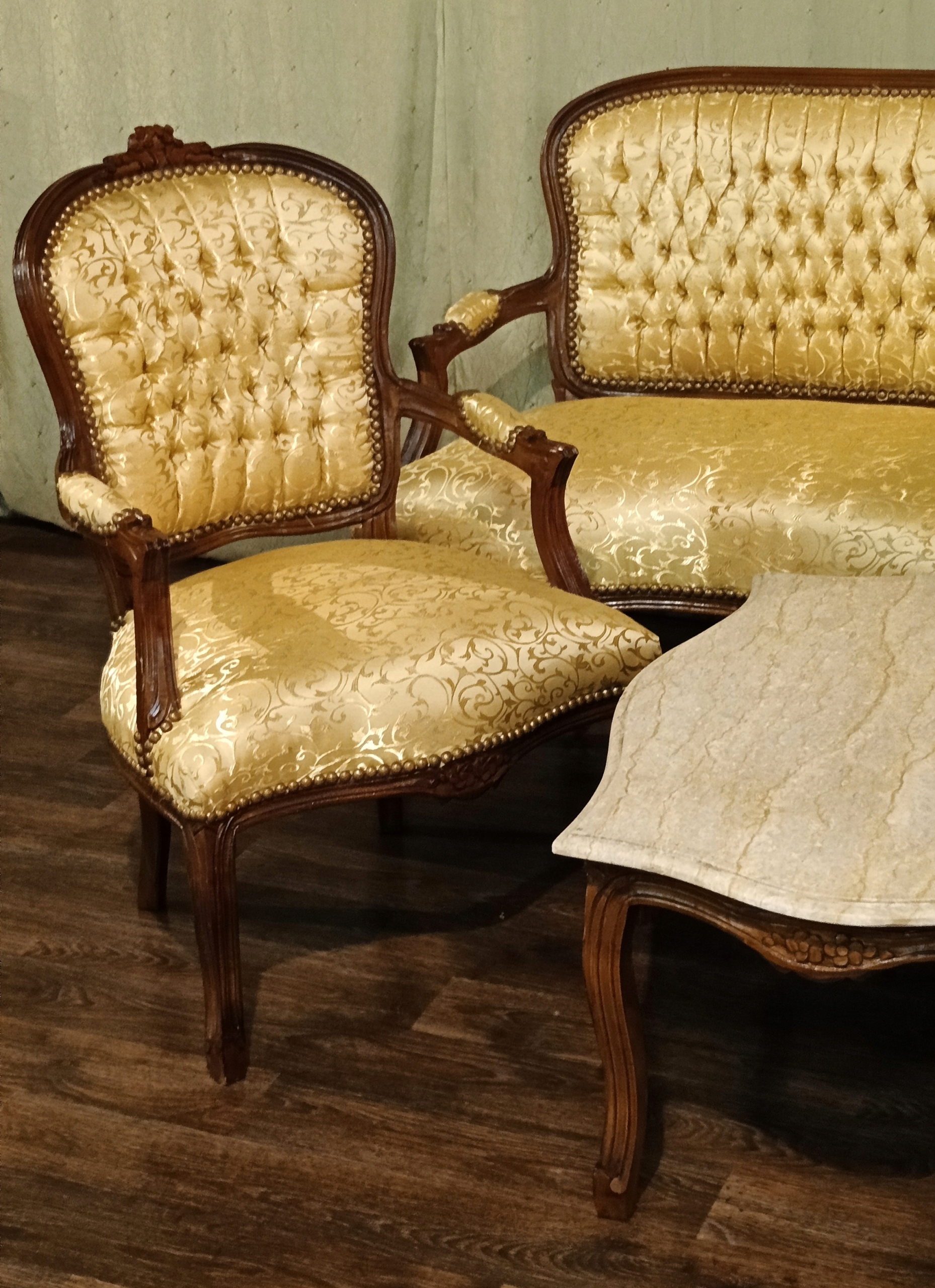 В комплект входят: диван, два кресла и журнальный столик со столешницей из мрамора песочного цвета. Древесина темного ореха. Обивка из материала золотистого цвета с нежным растительным орнаментом, переливающимся в зависимости от угла падения света; отделана изящной латунной булавкой - очень хорошее состояние.