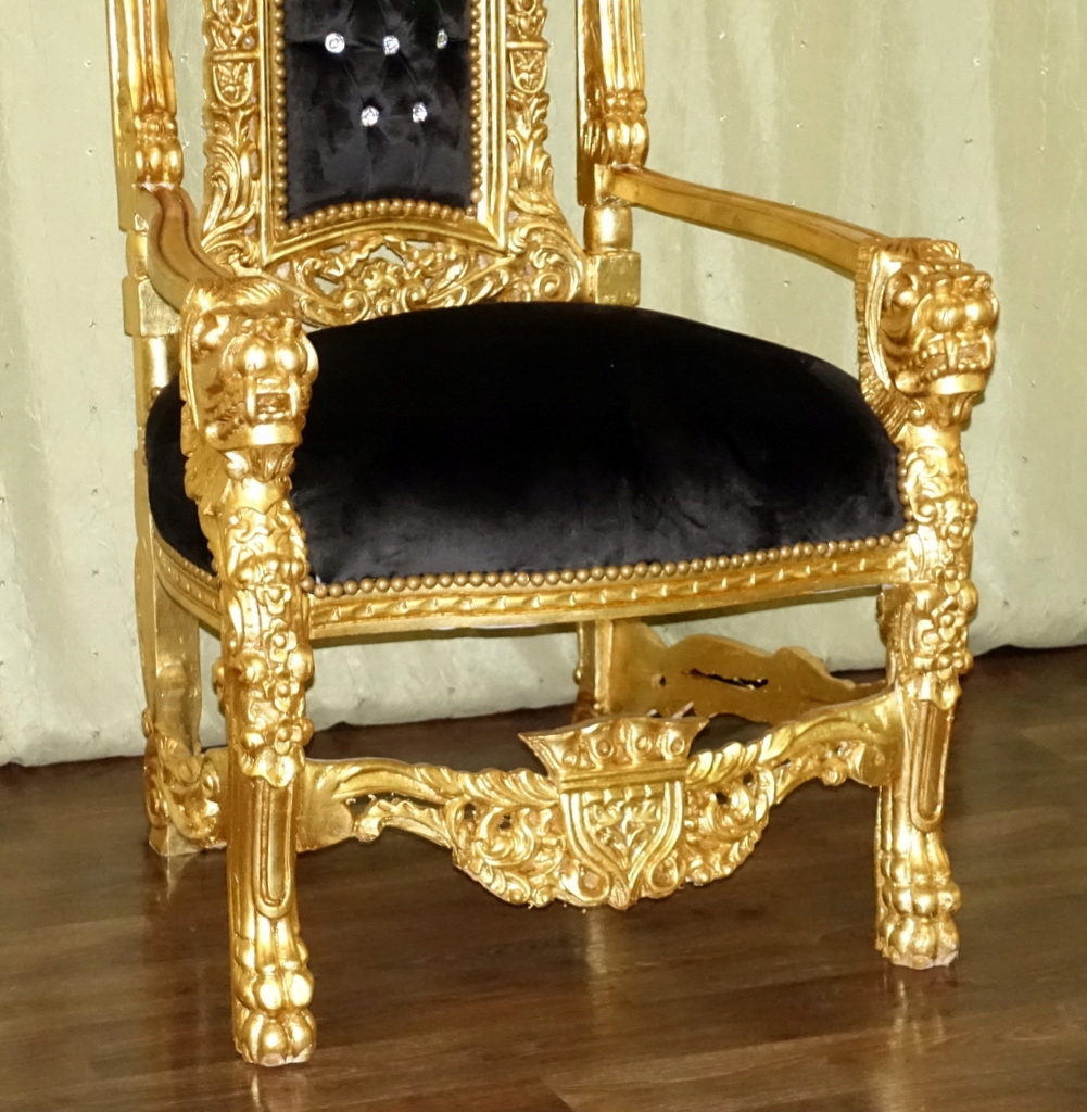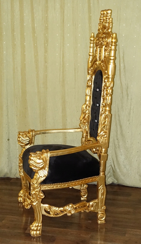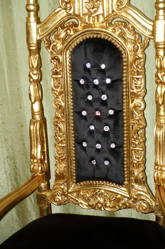 Стильное кресло - трон. Деревянное сооружение, как и подобает стилю барокко, богато украшено резьбой по золоту. Черная обивка из плюша, эстетично отделанная латунной булавкой, стеганая спинка и украшенная блестками Swarovski. Предмет мебели, сделанный современным, сохраняя при этом старые формы.