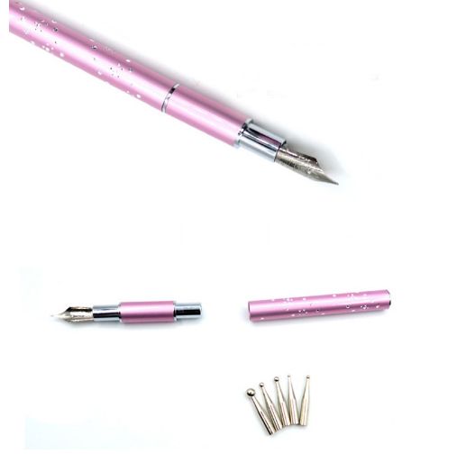 <р> Стилограф идеально подходит для техники One Stroke, создания различных форм и орнаментов. Благодаря ему можно создавать тончайшие, совершенные и аккуратные украшения, такие как микророспись, мехенди или контуринг. Ручка-декоратор – это просто гарантия уникального дизайна, который до сих пор был доступен только мастерам стиля. Забудьте об утомительной работе кистью, воспользуйтесь инновационным инструментом и сократите время работы почти вдвое. Ручка стилографа украшена блестящими камнями. Ручка непременно станет украшением любого салона красоты. <р> Способ применения: нанесите тонкий слой акриловой краски, акварельной краски, цветного УФ-геля или гибридного лака на стилограф посередине кончика пера. Сделайте узор на ранее матовом ногте. Дождитесь полного высыхания и покройте топовым слоем. Если используются гибридные лаки или УФ-гели, рисунок следует затвердеть в лампе. Закончив, протрите наконечник и наденьте колпачок, чтобы защитить его. В набор входит 5 насадок. <р> Общая длина: 15 см. <р> Длина кончика: 2,3 см.