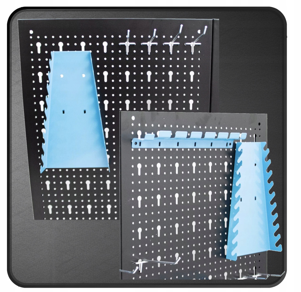 Таблица прикреплена к практическим крючкам и ручкам b>, которые позволяют легко подвешивать и организовывать различные инструменты. Хранение еще более тяжелых инструментов , таких как молотки или французские ключи