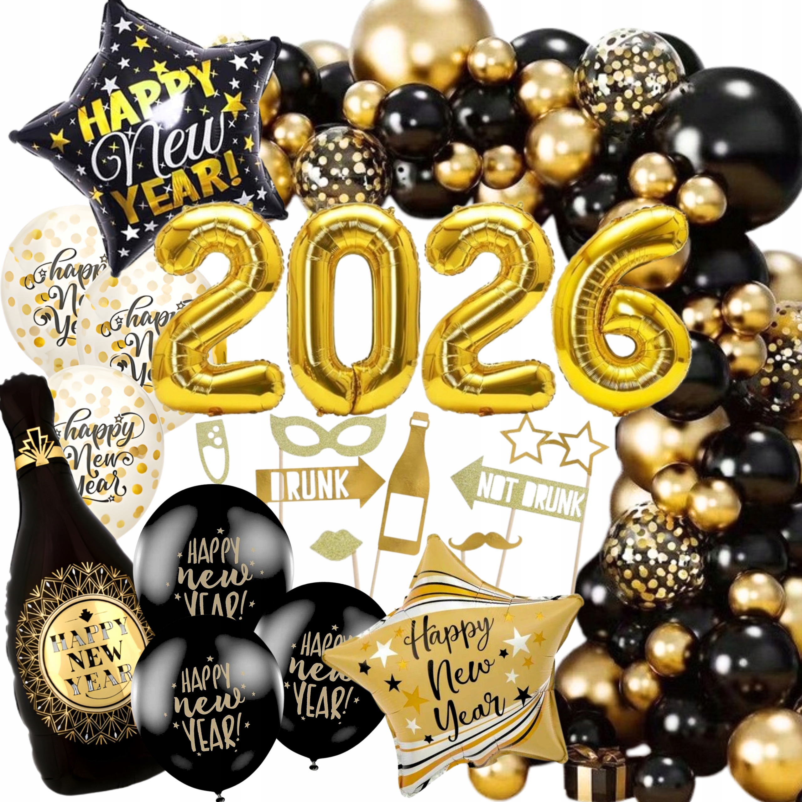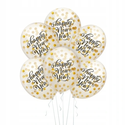 • Универсальные цвета: Черные, золотые и прозрачные воздушные шары с конфетти создают элегантную новогоднюю атмосферу.