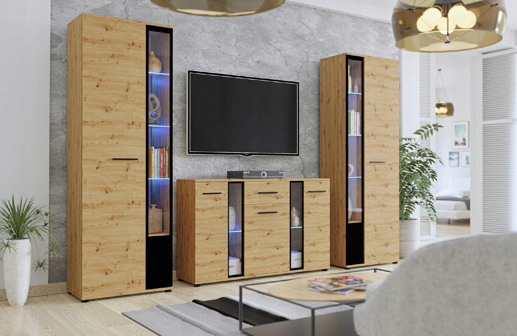Современная стенка, состоящая из двух высоких витрин и комода шириной 140 см с выдвижным ящиком. Одна из витрин оснащена рейкой для вешалок и полок с подсветкой, а другая четырьмя полками из ДСП и стеклянными полками, которые также могут быть подсвечены светодиодной подсветкой. Набор прекрасно впишется в любой интерьер гостиной. Мебель изготовлена из двустороннего ламината толщиной 16 мм, отличающегося высокой устойчивостью к механическим повреждениям.