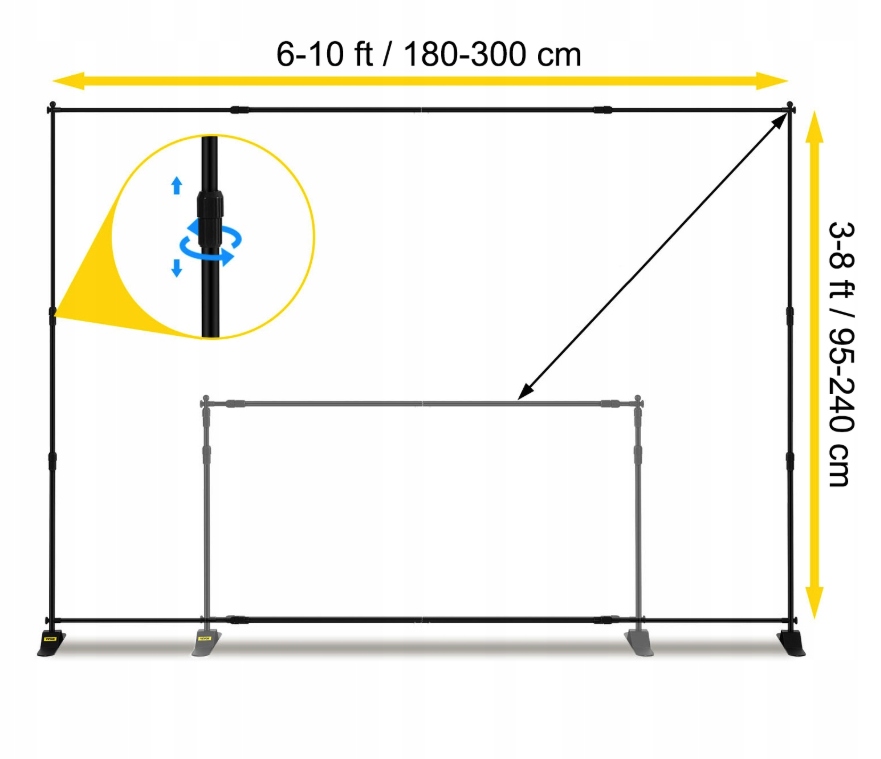 Телескопическая система обеспечивает плавную регулировку размеров b> - ширина от 170 до 300 см и высоты от 110 до 240 см. Благодаря этому вы сопоставите стойку как с меньшей графикой, так и с большими рекламными баннерами.
