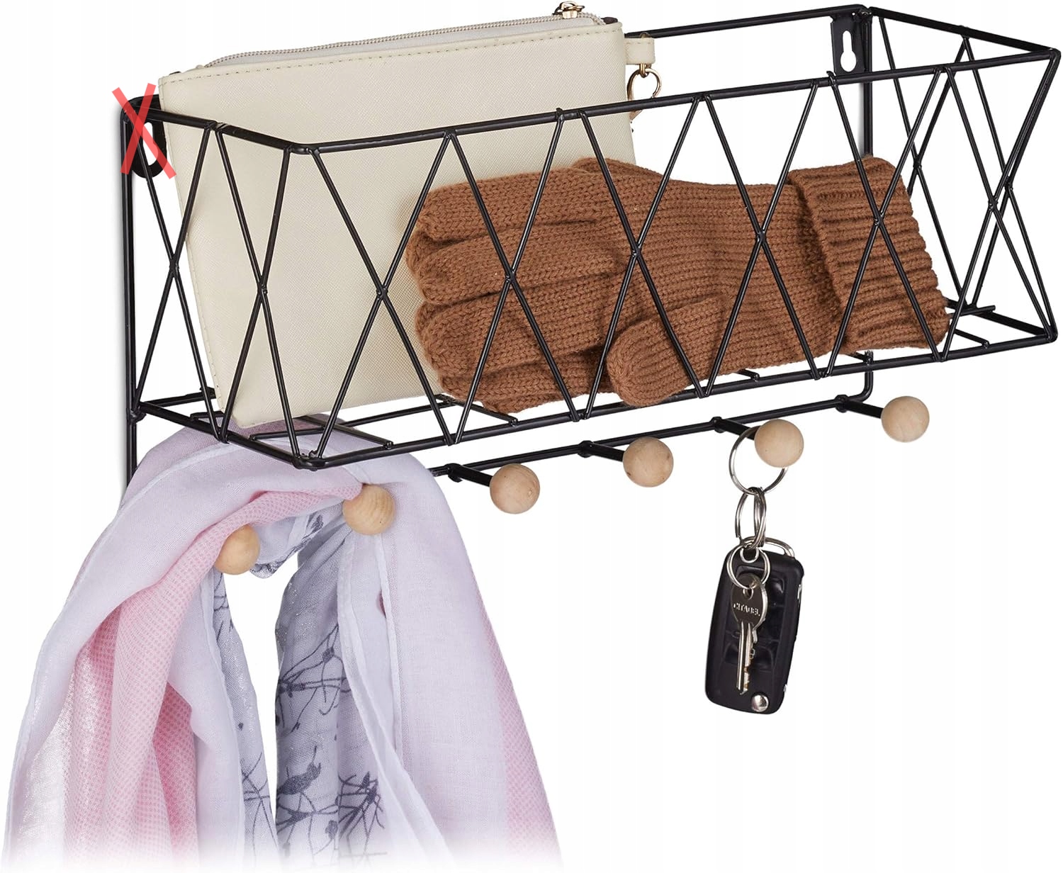 - Практическое: металлическая настенная полка с корзиной сетки и 6 крючков - вешалка, висящая в элегантном черном