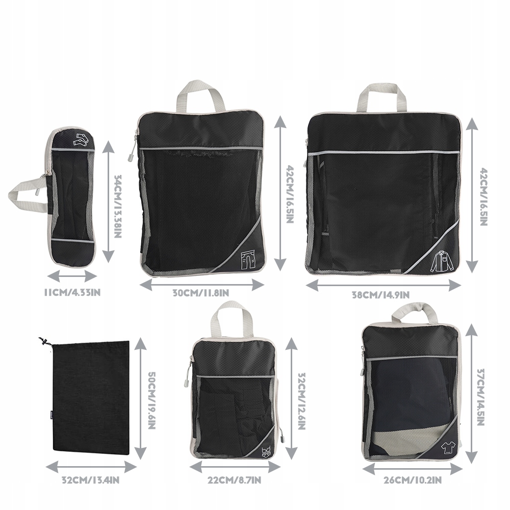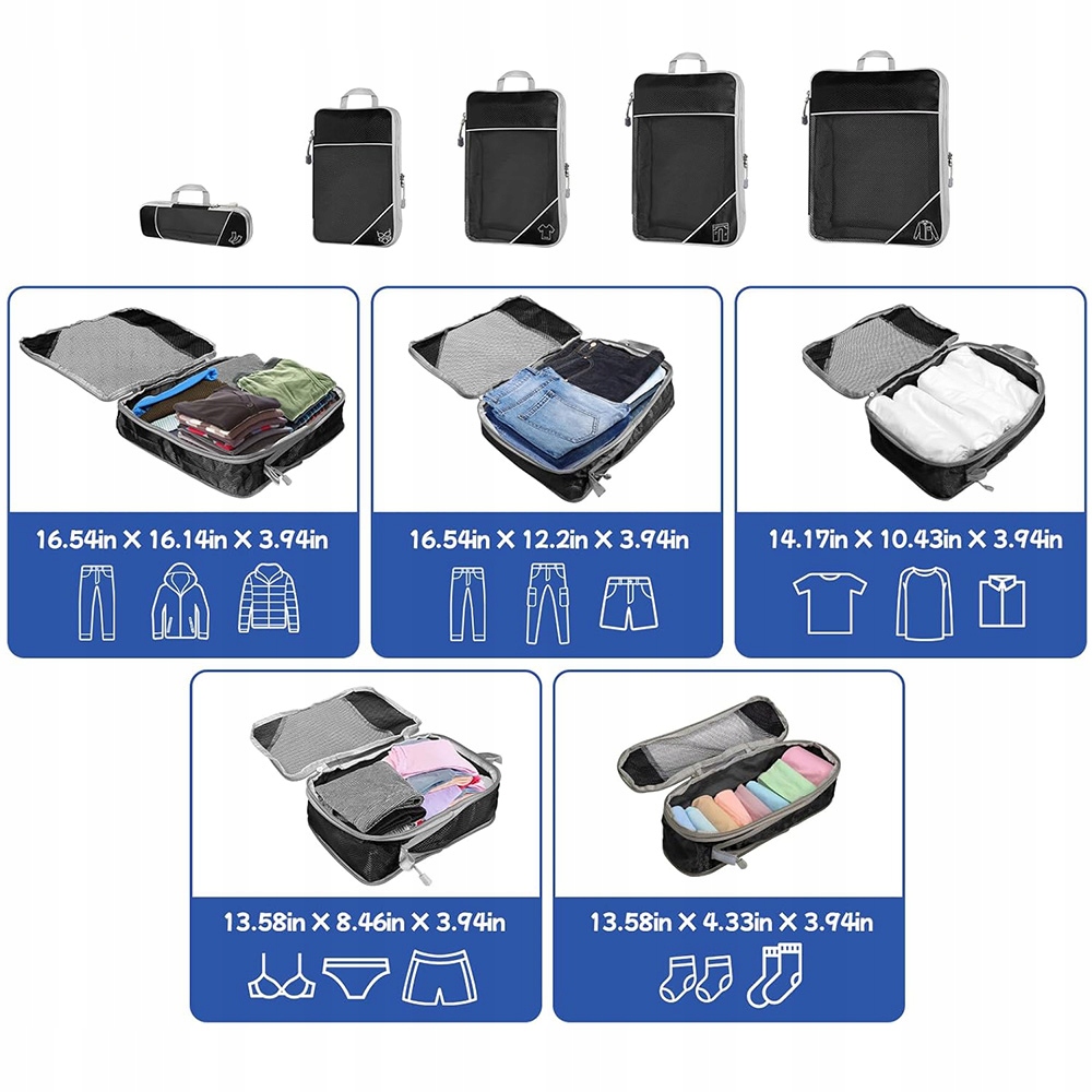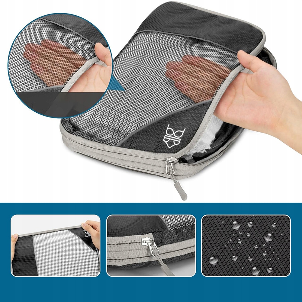 оснащены сжатием замков. Эти организаторы могут сэкономить до 60% места, сжав кубики упаковки, используя внешние прочные двойные двойные молнии. Они помогают перенести больше вещей в том же чемодане или сумке. Сетка голеностопного сустава подкреплена профессионально сделанными двойными швами для вентиляции и легкой идентификации контента.