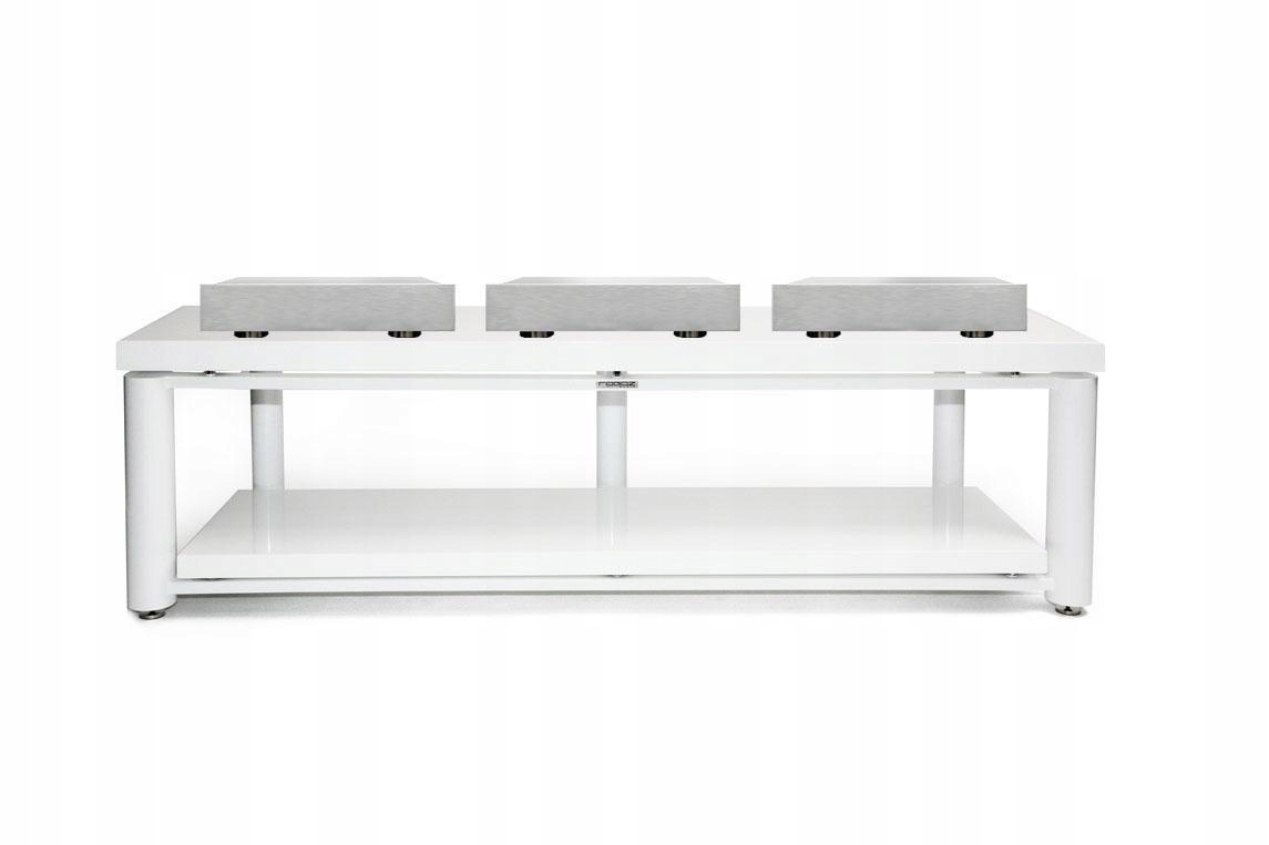 Стол пятиногий, двухуровневый, с белой лаковой столешницей (рояльный глянец). Каркас балластирован кварцевым песком (винтовые отверстия в задней части ножек позволяют менять количество и тип балласта). Цвет оправы - белый (рояльный глянец). Верхняя часть толщиной 50 мм оптимизирована для аналоговых проигрывателей и цифровых источников. Нижняя столешница имеет толщину 40 мм. Все столешницы отделены от каркаса стола системой BBS. Система BBS (Balancing Board System) обладает кинематическими и динамическими свойствами, позволяющими «плавать» изолируемым массам вбок относительно оси системы, сохраняя при этом точечную опору.Система также обеспечивает возможность выравнивания столешниц.