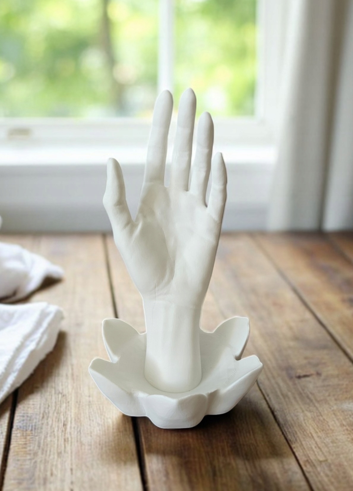 Уникальная ювелирная и часовая стенда, сочетая элегантность с современной технологией 3D -печати. Его форма, изображающая реалистичную руку, выходящую из цветочной базы Lotos, является не только практическим решением, но и дизайнерским акцентом в любом интерьере.