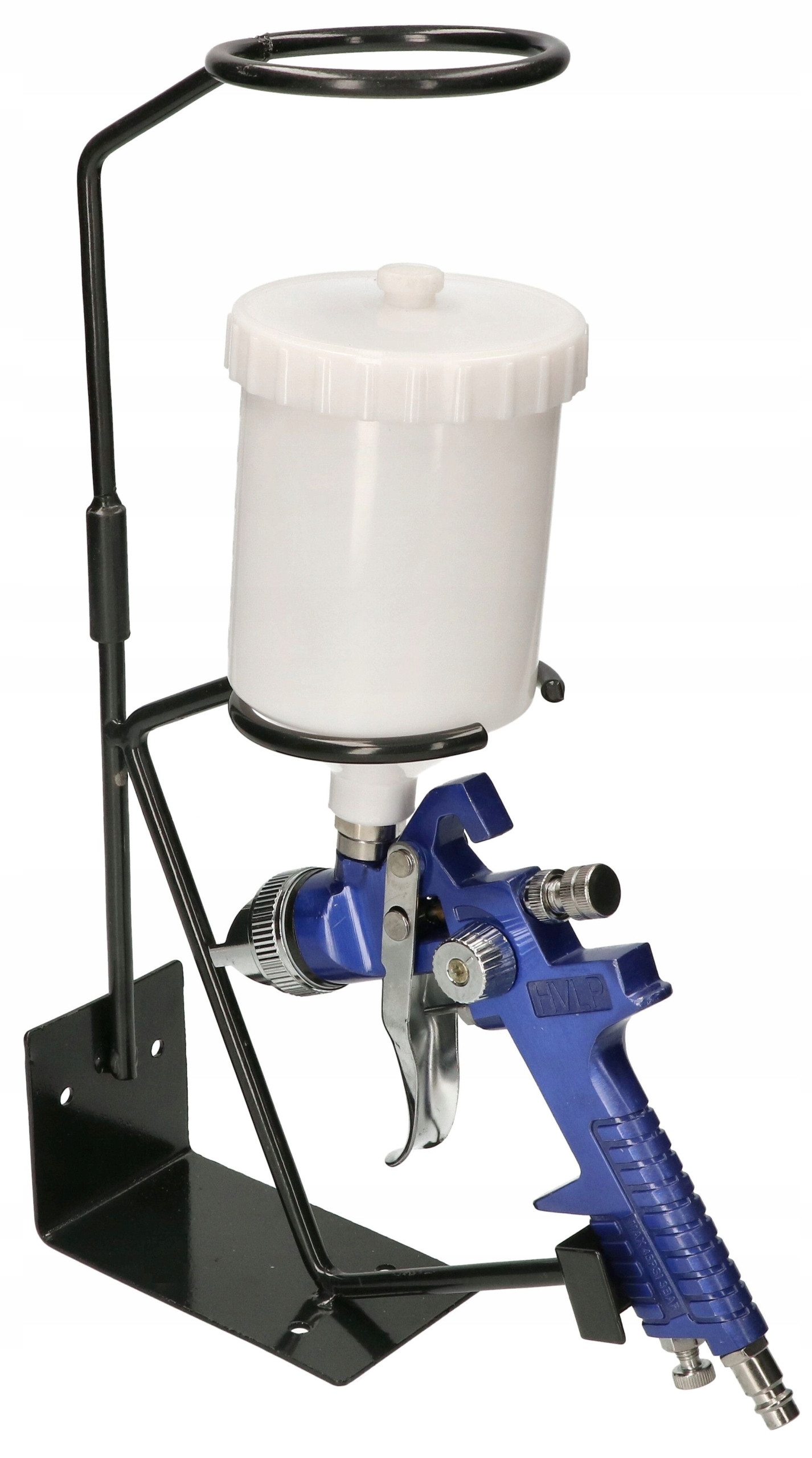 - Практическая подставка позволяет поставить пистолет верхней чашкой, не отсоединяя шланг сжатого воздуха.