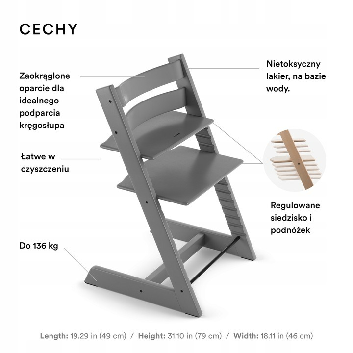 Стульчик Stokke изготовлен из массива бука или дуба и обеспечивает прочность до 136 кг, а значит, им могут пользоваться даже взрослые. Подставка для ног и удлиненные направляющие придают ребенку устойчивость и ощущение безопасности.