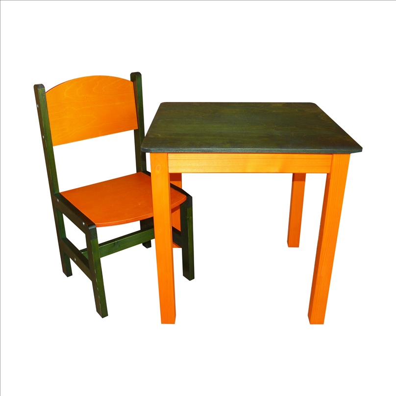 Комплект состоит из стола и стула. Он был изготовлен из еловой древесины, покрытой морилкой, а затем лаком. Набор в ярких тонах прекрасно дополнит мебель детской комнаты и сделает ее интерьер теплым и веселым. Мебель функциональна и не занимает много места. Стул очень удобный, а на столе достаточно места для игры. Ваши дети найдут идеальное место для игр, рисования и даже приема пищи.