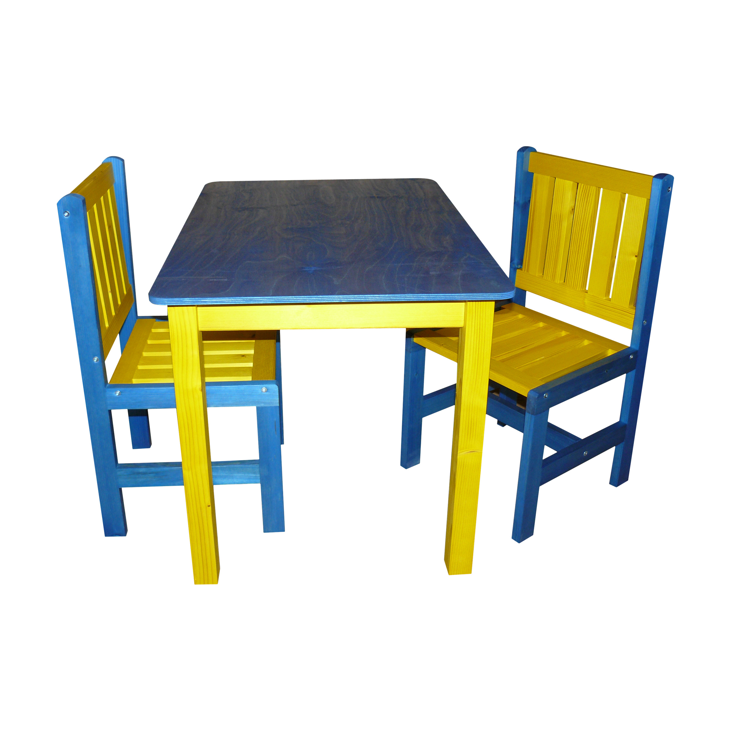 Комплект состоит из стола и два стула. Он был изготовлен из еловой древесины, покрытой морилкой, а затем лаком. Мебель ярких цветов прекрасно дополнит обстановку детской комнаты и сделает ее интерьер теплым и веселым. Они функциональны и не занимают много места. Стул очень удобный, а за столом достаточно места для игры нескольких детей. Ваши дети найдут идеальное место для игр, рисования и даже приема пищи.