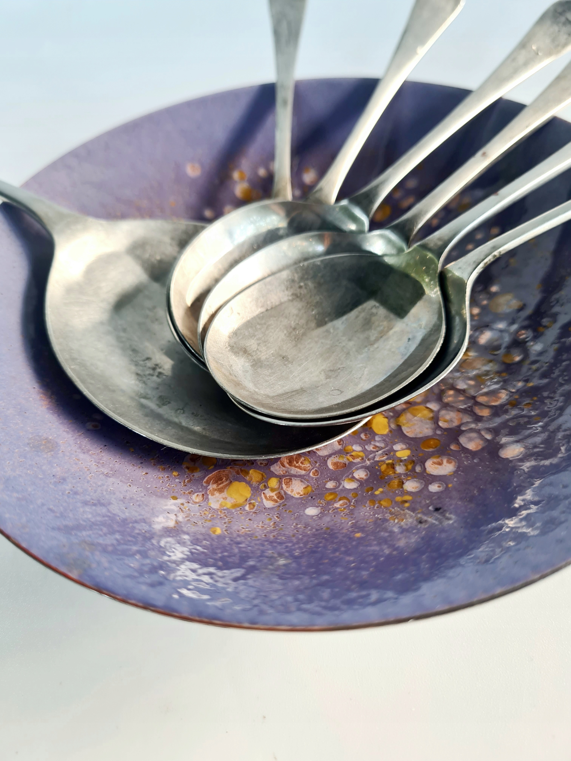 Набор содержит 6 столовых ложек, они не очищаются. Я оставляю их в состоянии, как на фотографиях. Патерка на картинках под столовой обслуживает только визуализацию (и доступна в рекламе).