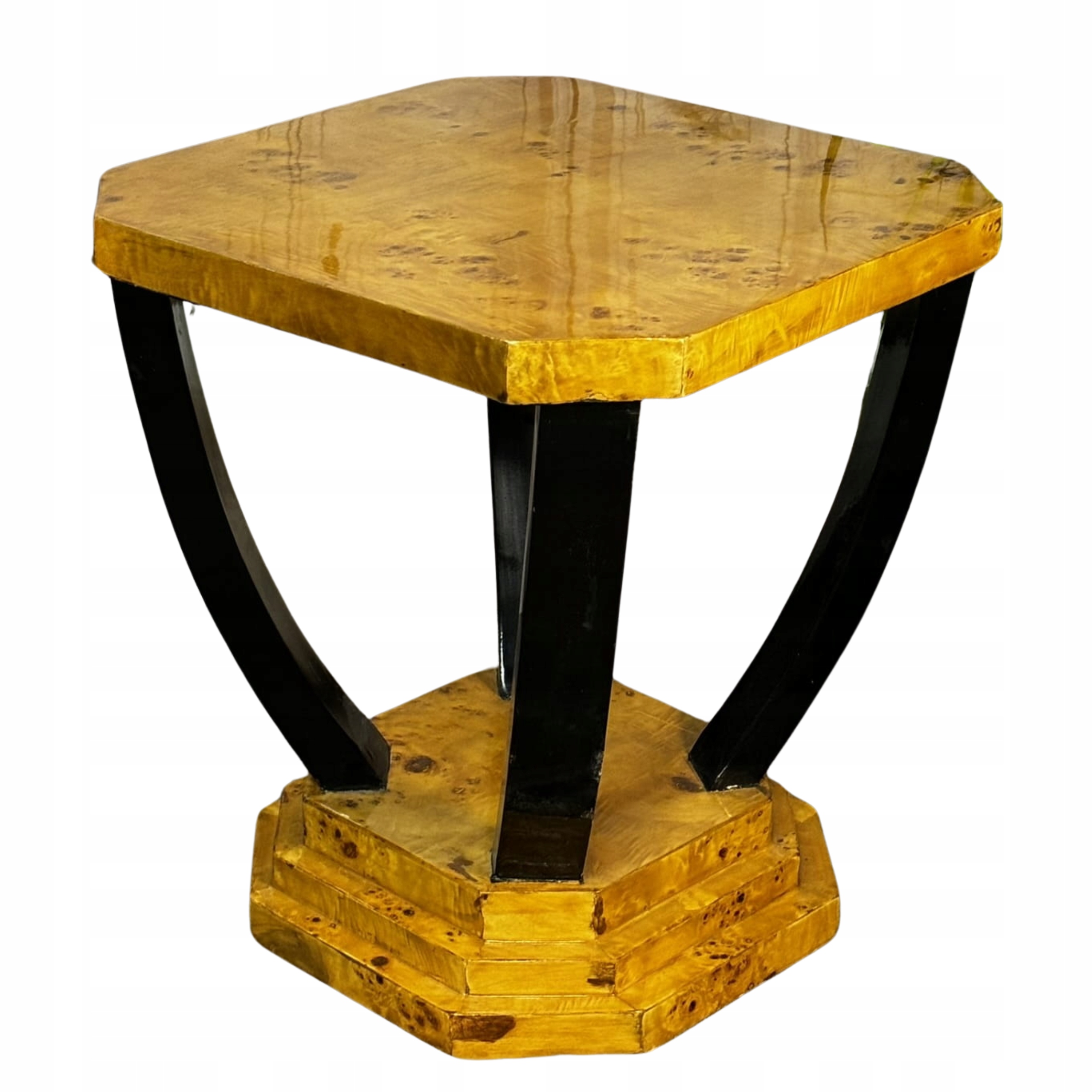 <ул>Откройте для себя уникальный стол в стиле ар-деко, который сочетает в себе элегантность и прочность с уникальным геометрическим дизайном. Изготовленный из натурального дерева, с характерной восьмиугольной столешницей и украшенный черными лакированными арочными ножками, этот стол является квинтэссенцией стиля 1920-1930-х годов.