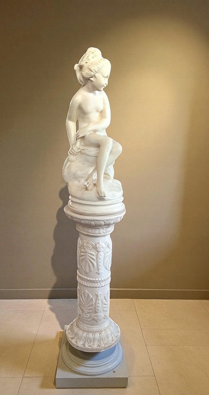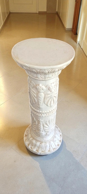 Изготовлен из конгломерата шлифованного камня и смолы оттенка античного белого, дополнительно украшен древнегреческими мотивами. Он выглядит очень красиво и наверняка станет отличным практичным украшением стильного интерьера или стильным акцентом в современном. На последних трех фотографиях видны небольшие повреждения, которые были учтены при оценке.