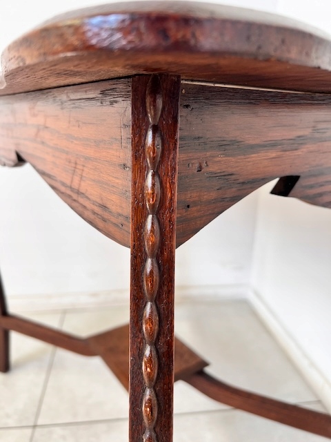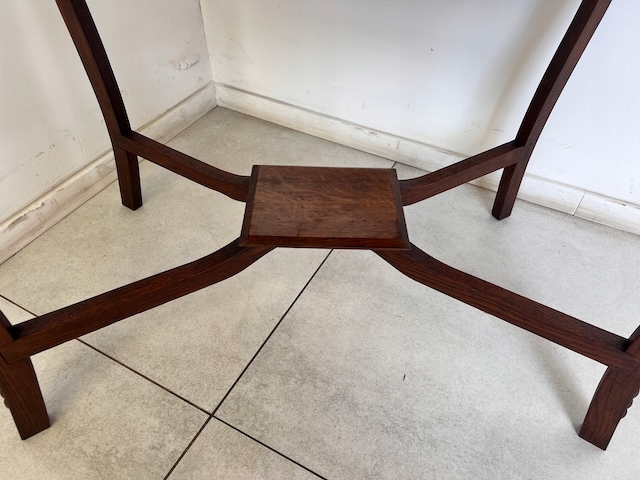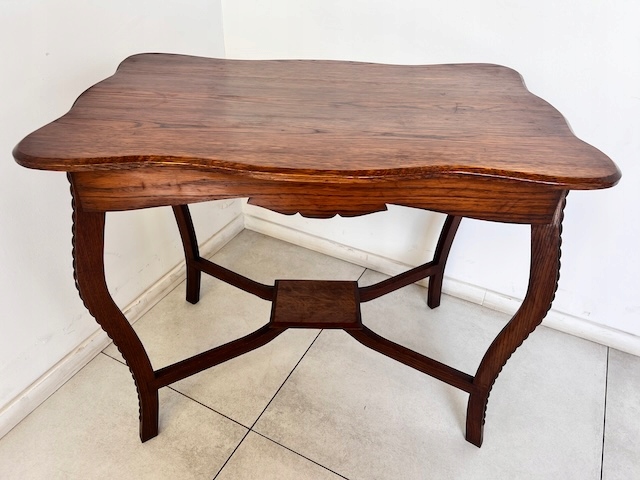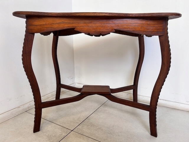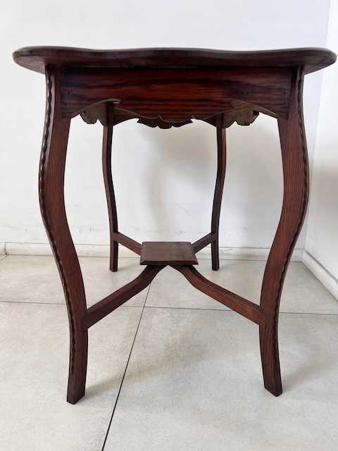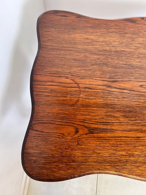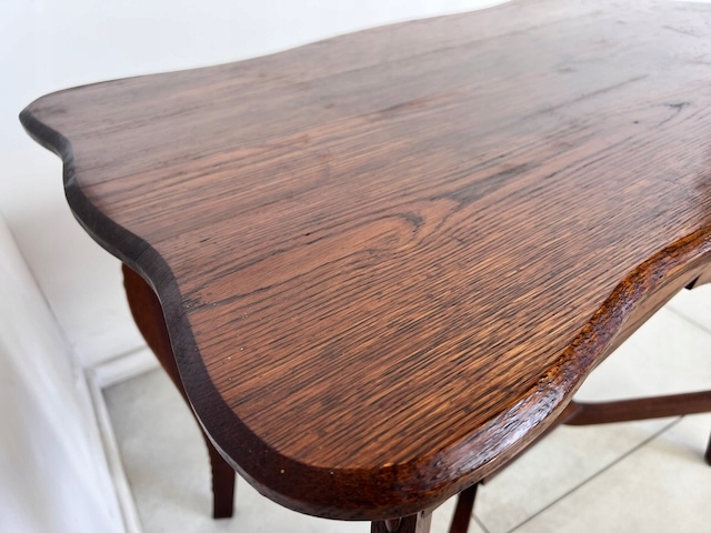 Дубовый стол, столик небольшой. Очень красиво, деликатно оформлено. Он в хорошем состоянии. Повреждений и дефектов нет. На нем видны типичные следы использования; меньшие или большие царапины и небольшое изменение цвета. Ножки соединены красивым крестом. Стол устойчив. Готов к установке.