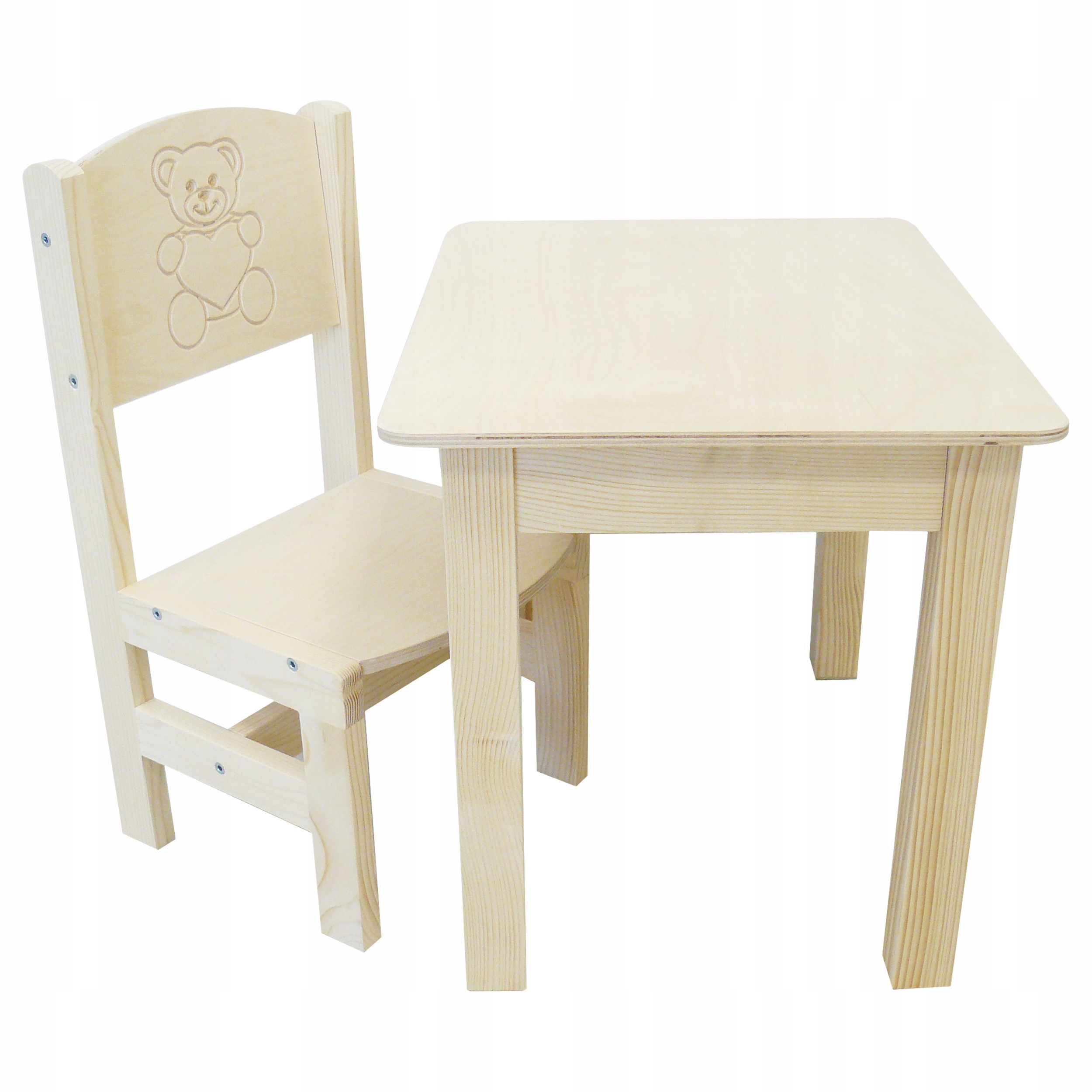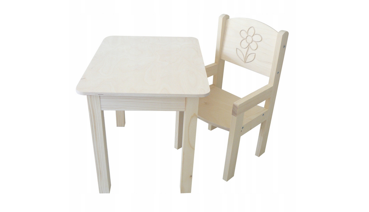 Комплект состоит из стола и стула. Он изготовлен из древесины ели, не покрыт лаком. Мебель прекрасно дополнит обстановку детской комнаты и сделает ее интерьер теплым и радостным. Они функциональны и не занимают много места. Стулья очень удобные, а за столом достаточно места для игры нескольких детей. Ваши дети найдут идеальное место для игр, рисования и даже приема пищи.