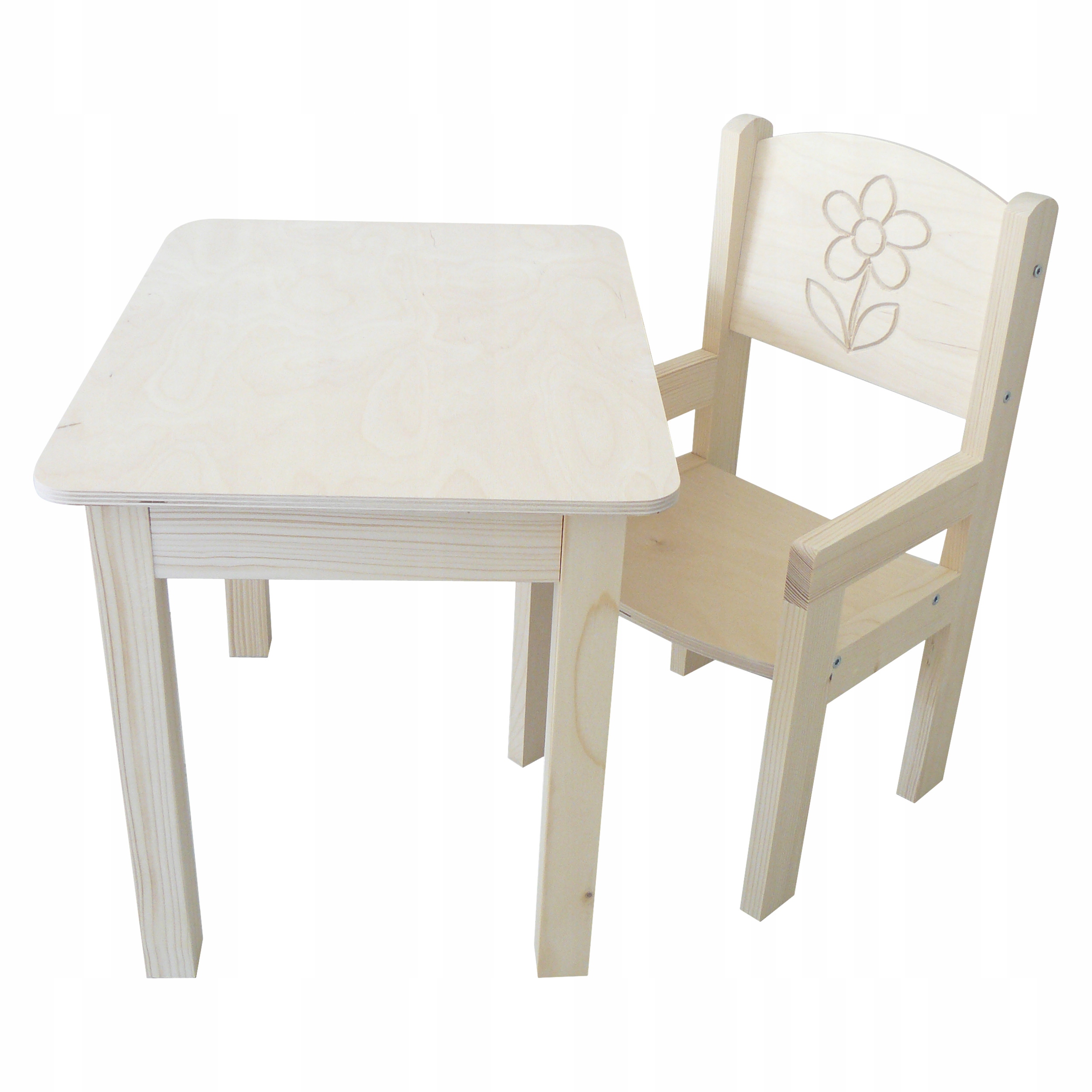 комплект состоит из стола и стульев. Он изготовлен из древесины ели, не покрыт лаком. Набор прекрасно дополнит мебель детской комнаты и сделает ее интерьер теплым и веселым. На спинке имеется декоративная гравировка, которую вы можете выбрать из нашей книги выкроек. Мебель функциональна и не занимает много места. Стул очень удобный, а на столе достаточно места для игры. Ваши дети найдут идеальное место для игр, рисования и даже приема пищи.