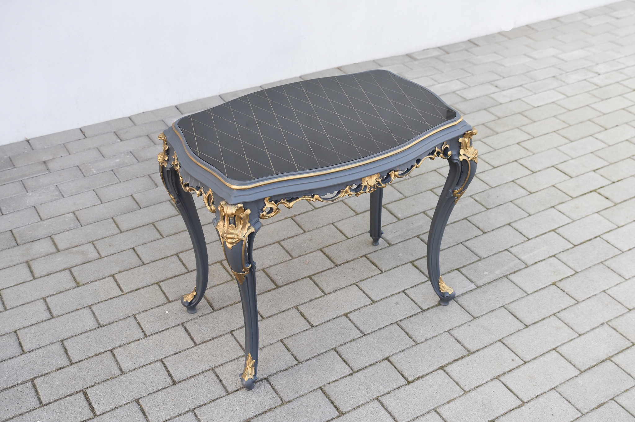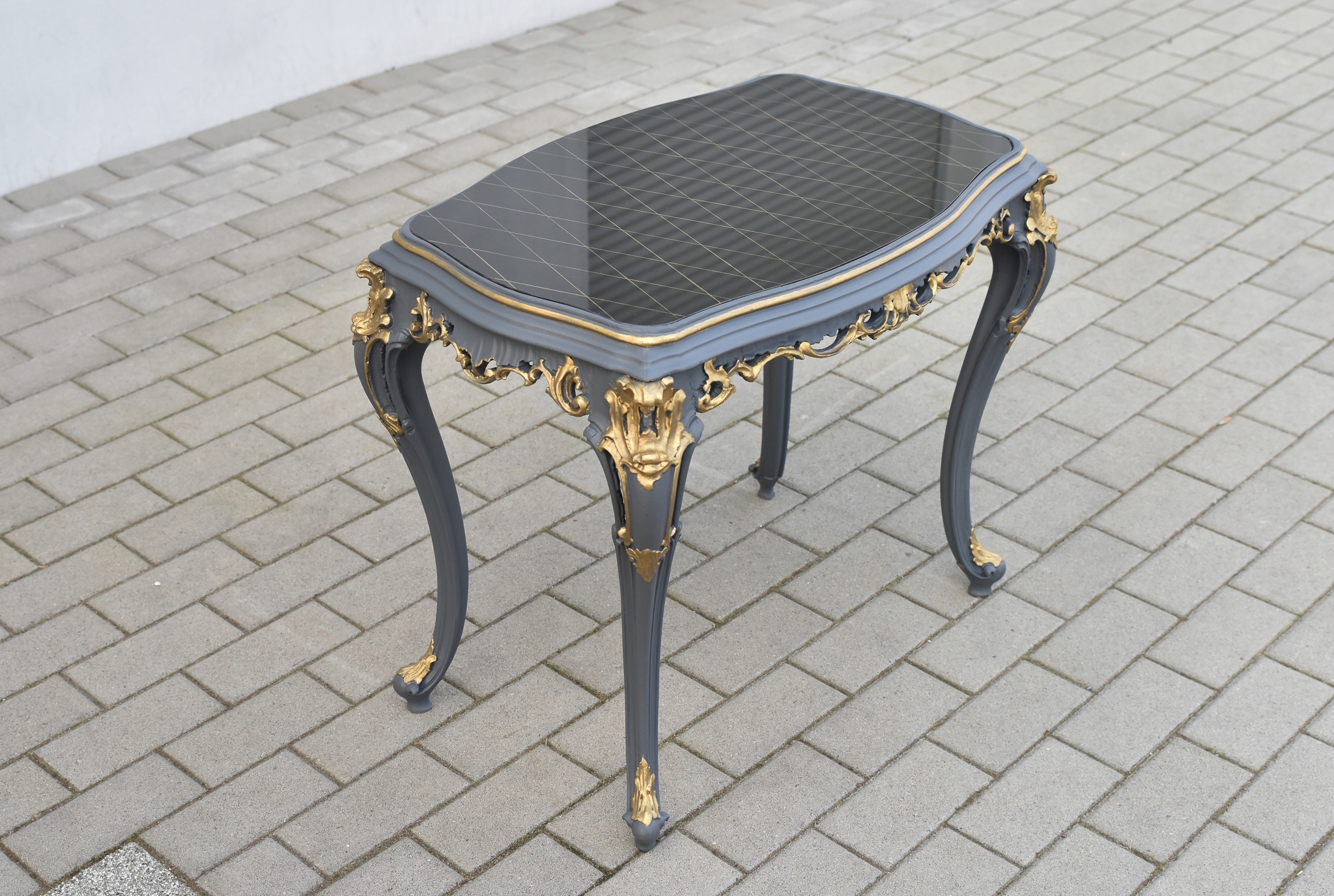 Выполнен полностью из массива дерева, интересно декорирован, сверху покрыт черным стеклом.
