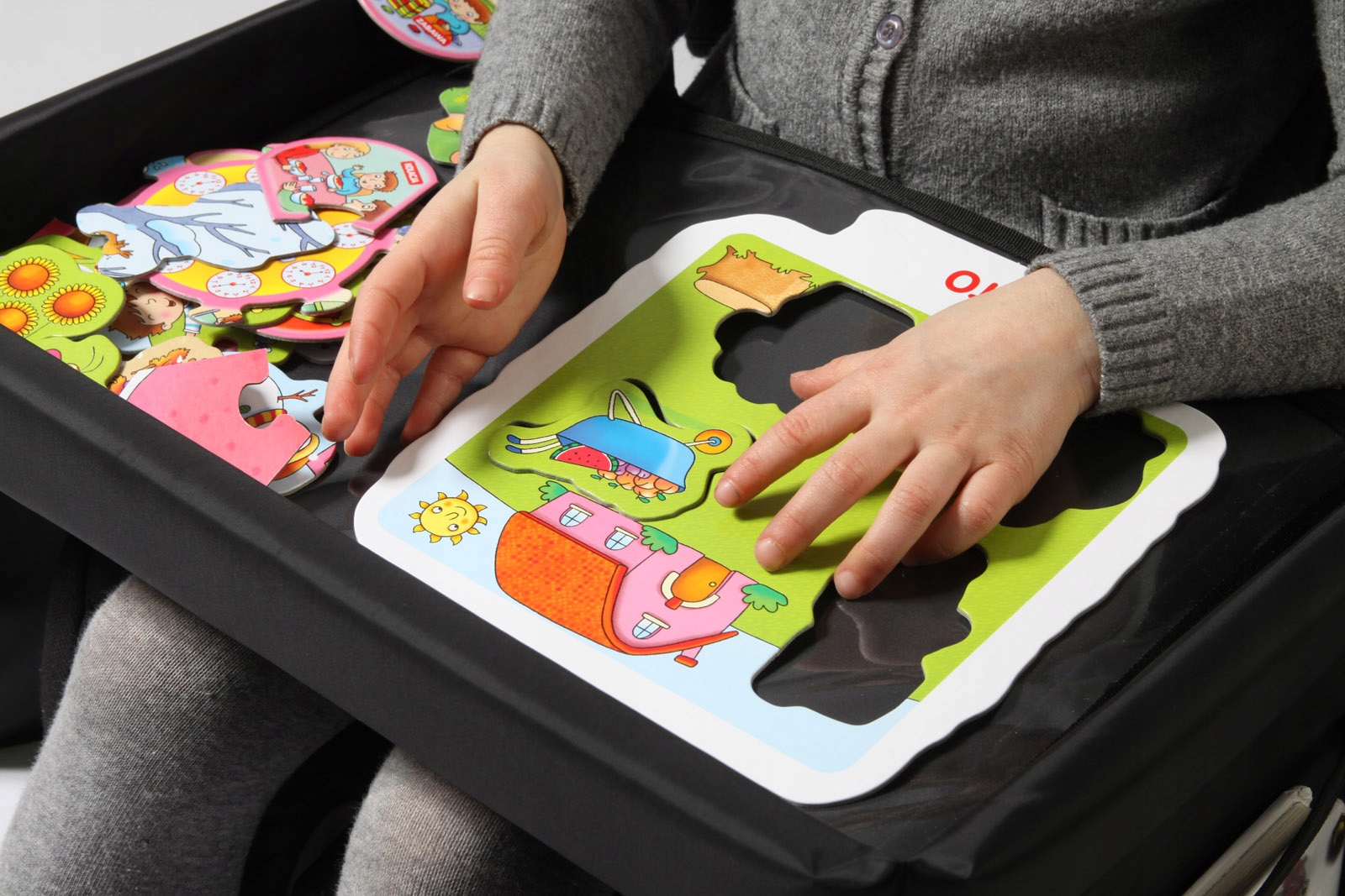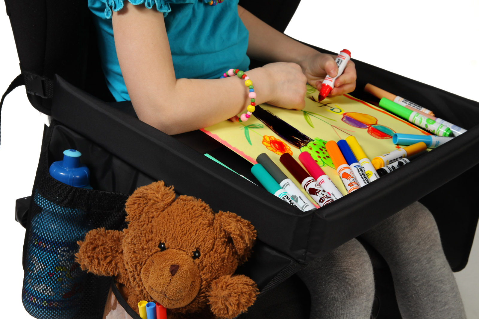 Этот чрезвычайно изобретательный стол позволяет ребенку собирать пазлы, рисовать или есть во время путешествия на машине или даже в коляске, автобусе или самолете. На столешнице имеется прозрачный карман, который может служить рамкой для детских рисунков или карты Европы, прилагаемой к столу. У него есть боковые карманы, в которые можно спрятать мелки, бутылку с водой или любимые книги.