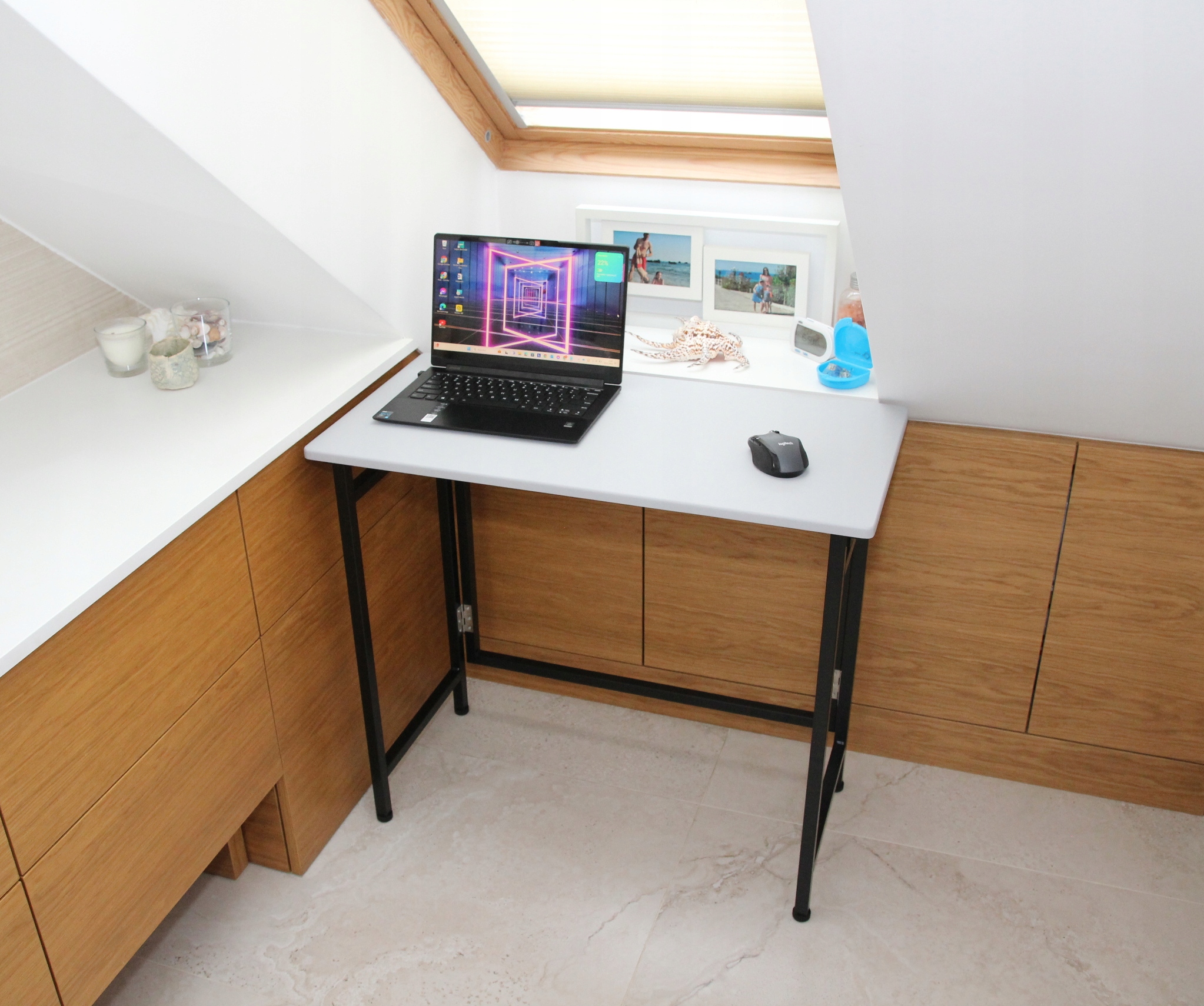 Современный вид впечатляет своей простотой и практичностью. Стол позволяет экономить место в квартире или офисе. Простая система сборки и разборки означает, что после окончания работы вы сможете собрать стол всего за несколько секунд. Вся конструкция очень устойчива благодаря использованию двух петель с каждой стороны.