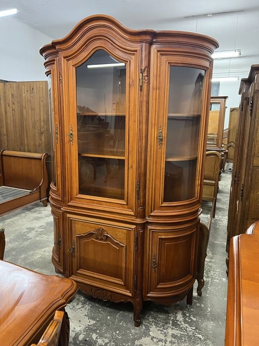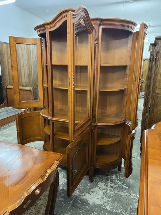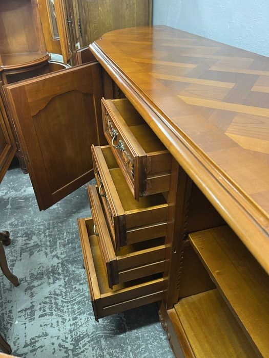 В комплект входит раздвижной стол, 6 стульев с резными спинками, большой комод и витрина.
