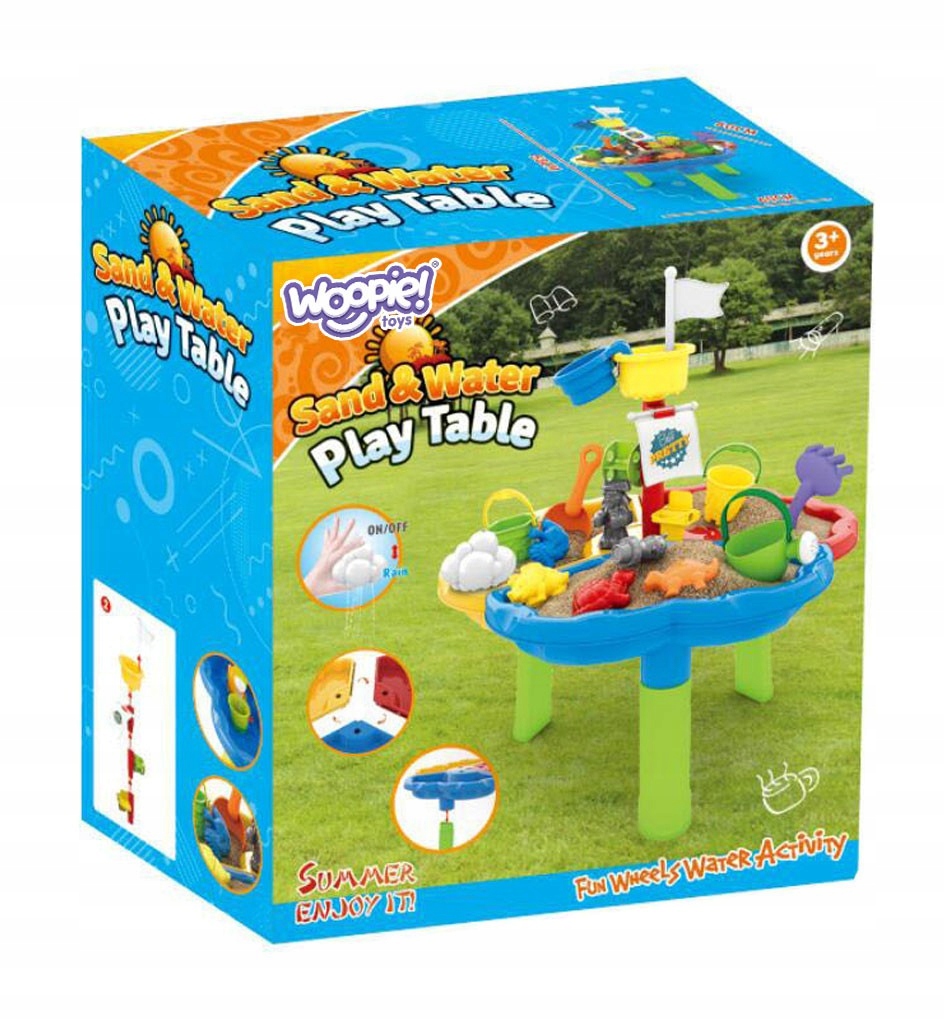Песочный стол от бренда WOOPIE — идеальная игрушка для игры с водой и песок. В набор входят 13 аксессуаров: стол со съемными ножками, формочки, ведра, лейка, лопатка и многое другое. Стол разделен на три части, в одну можно наливать воду, во вторую песок, а в третью строить! Набор предназначен для игр в помещении и на улице. Идеально подходит для игры дома, на пляже или в песочнице.