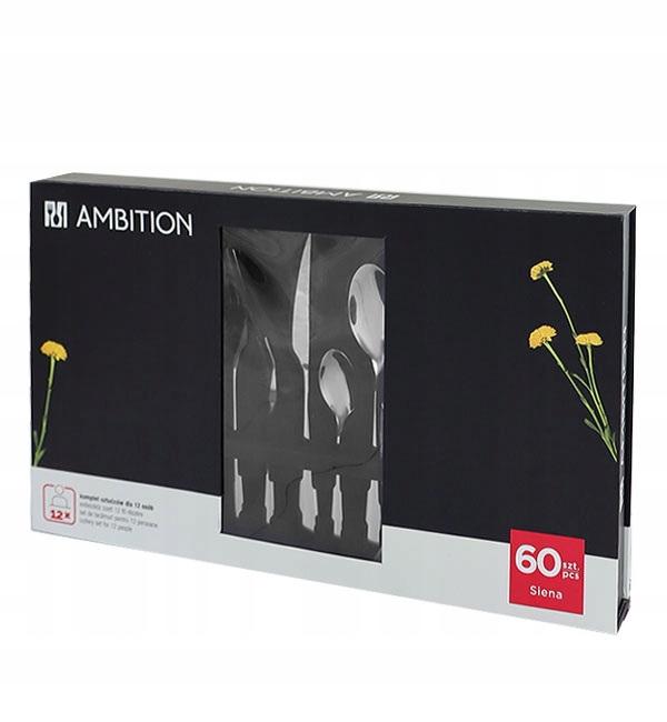 СТОЛОВІ ПРИБОРИ AMBITION SIENA 60 ШТ. НА 12 ОСІБ ЯЩИК ГЛЯНЦЕВА СТАЛЬ 18/10