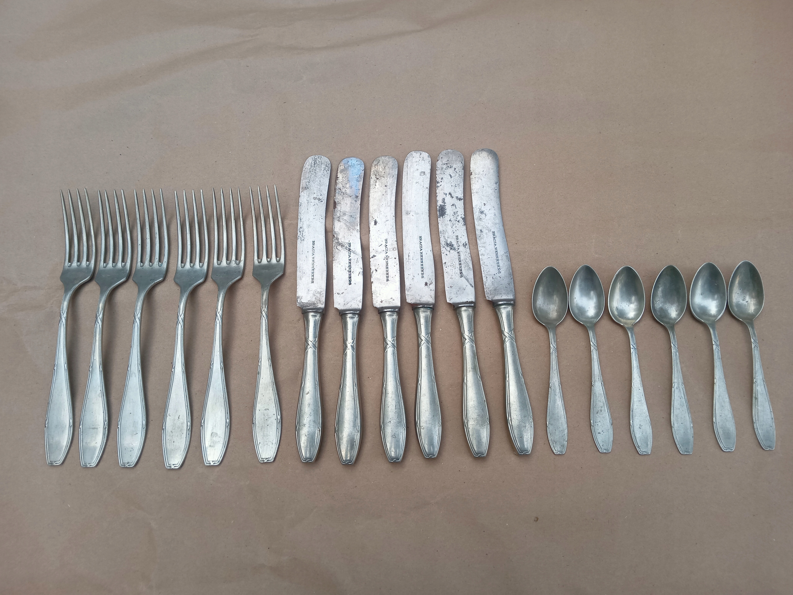 18 штук, альпака, изменение цвета столовых приборов, . концы лопастей вилок без перекосов, концы лопастей вилок одинаковой длины, лезвия ножей не заточены, все столовые приборы подписаны довоенной фабрикой BRACIA HENNEBERG, состояние как на фотографиях, длина ножей 24,5 см, вилок - длина 21,5 см, чайных ложек - длина 13,5 см