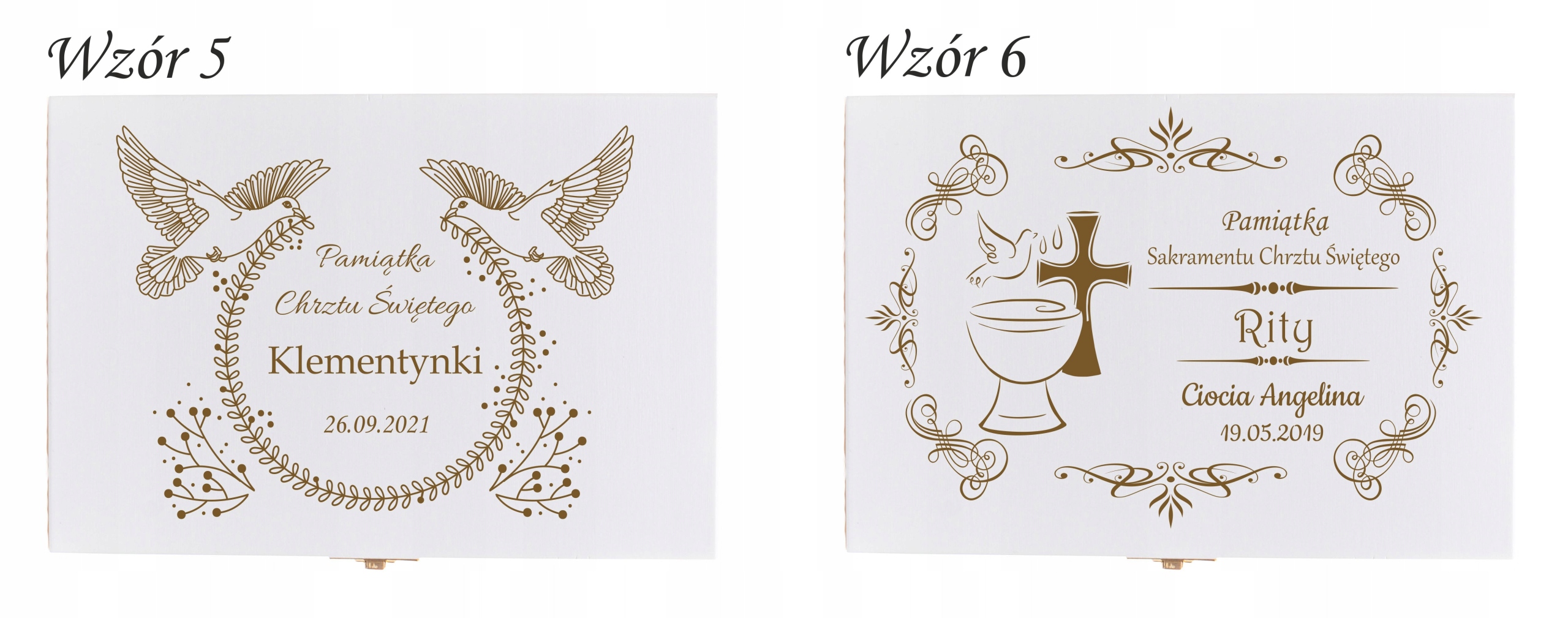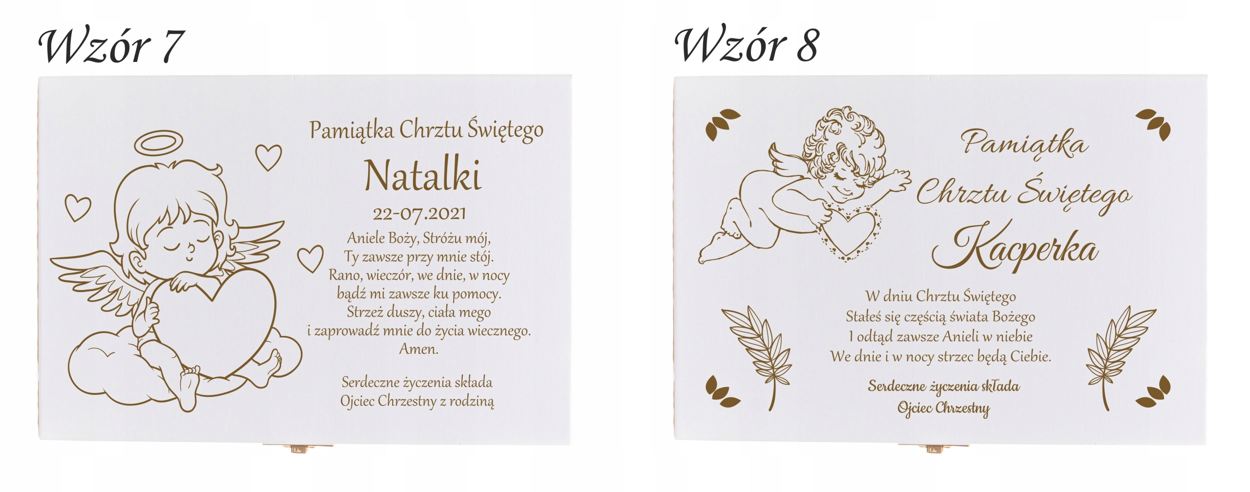 Столовые приборы для детей, помещенные в деревянную коробку, - интересная идея подарка на крещение или день рождения. В комплект входят качественные вилка, нож, ложка и чайная ложка. Декоративные столовые приборы для детей станут приятным дополнением к трапезе даже самому привередливому едоку. Дополнительно мы можем гравировать все элементы с указанной вами гравировкой - например. имя вашего ребенка. На крышке коробки мы можем выгравировать индивидуальное посвящение по шаблонам, подготовленным ниже.