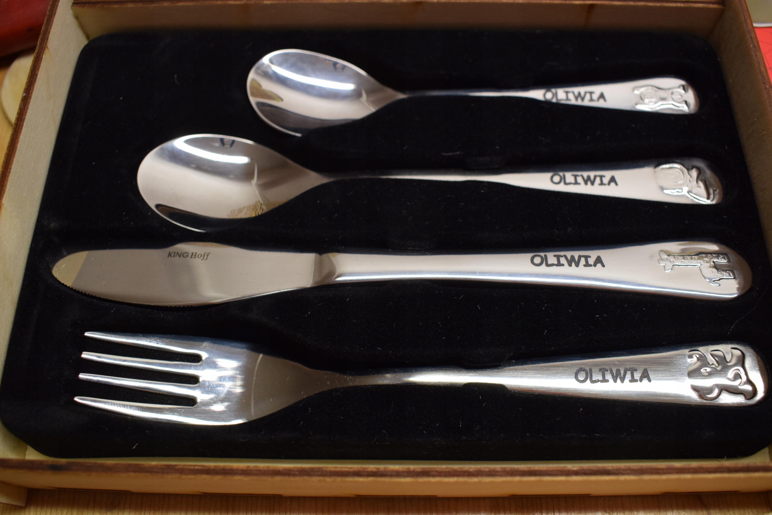 Детские столовые приборы с индивидуальной гравировкой и декоративной деревянной шкатулкой с 3D надписью